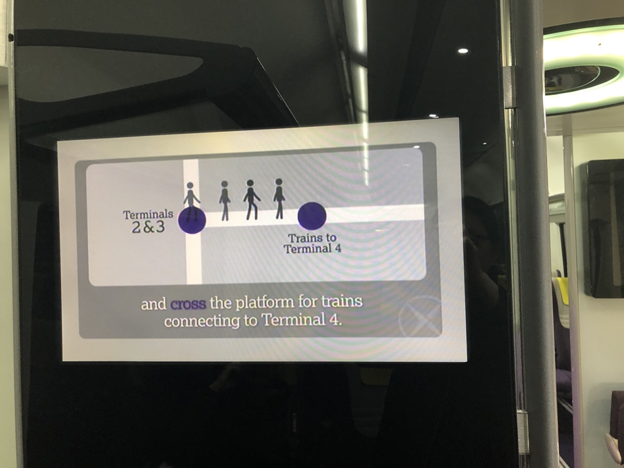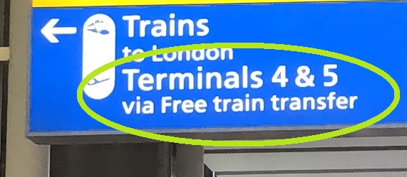 안내판이 사진처럼 노란색과 파란색으로 되어 있는데, 파란색에 보면 'Terminal 4 & 5 via Free train transfer'이라고 적혀 있다.