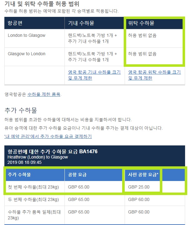 영국항공인데 수화물도 따로 계산해야 하다니. LCC도 아니고 국적기 같은데 위탁 수화물에 추가 요금을 받다니!