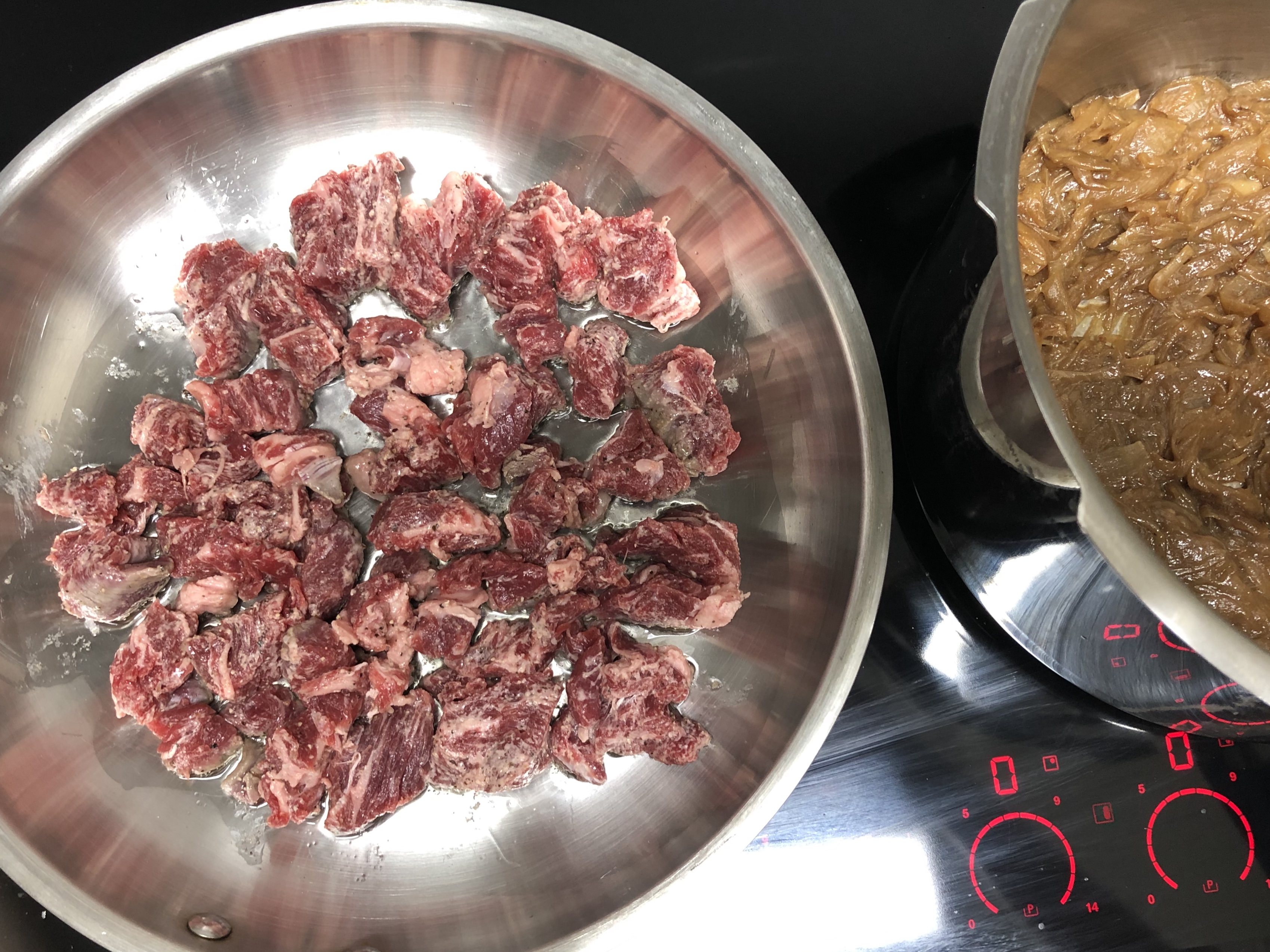 난 냄비에 양파부터 담아 버려서 그냥 후라이팬에 소고기를 구웠다.