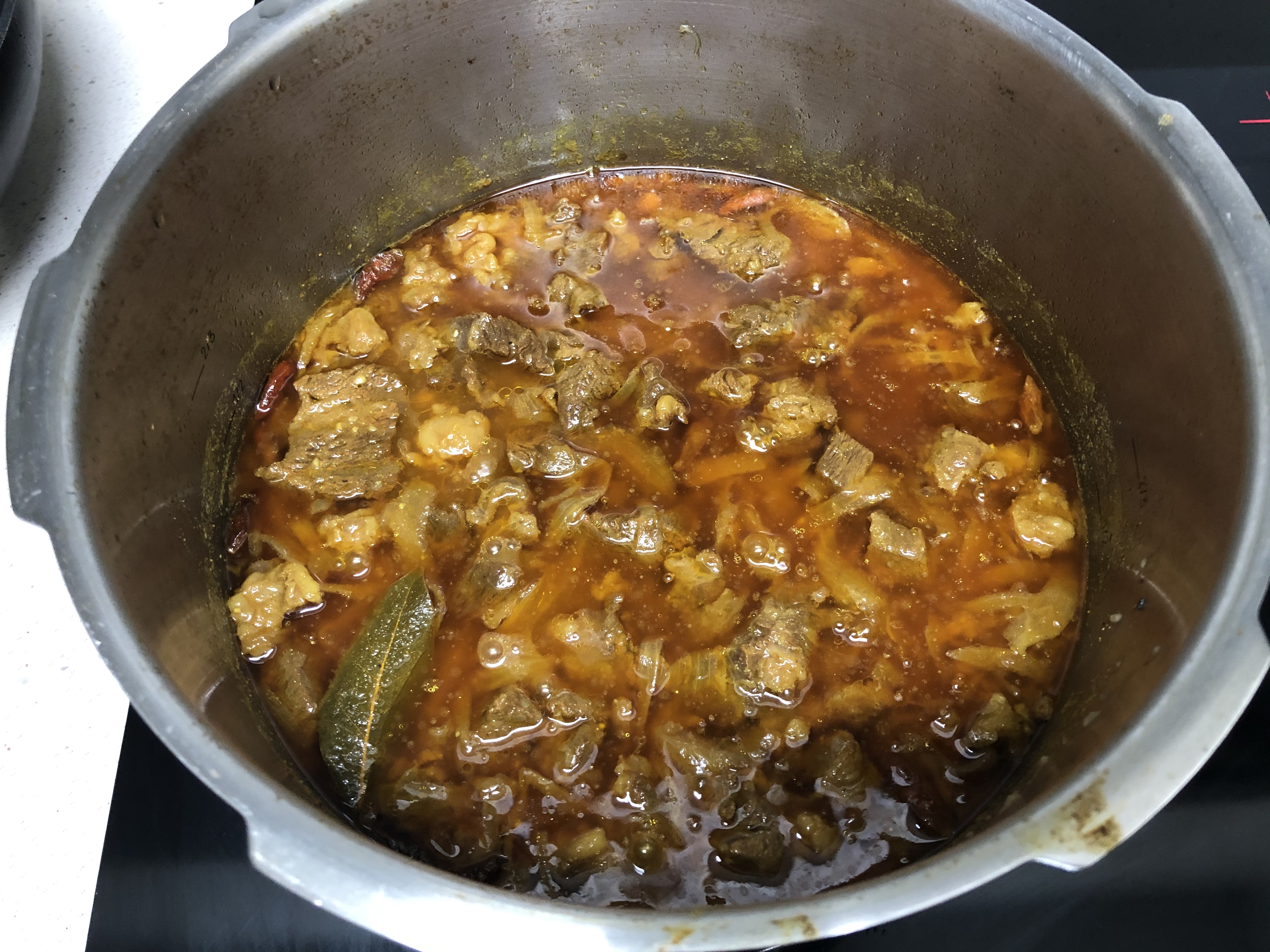 3. 볶은 소고기에 물 1리터를 붓고 카레 양념을 다 넣는다.