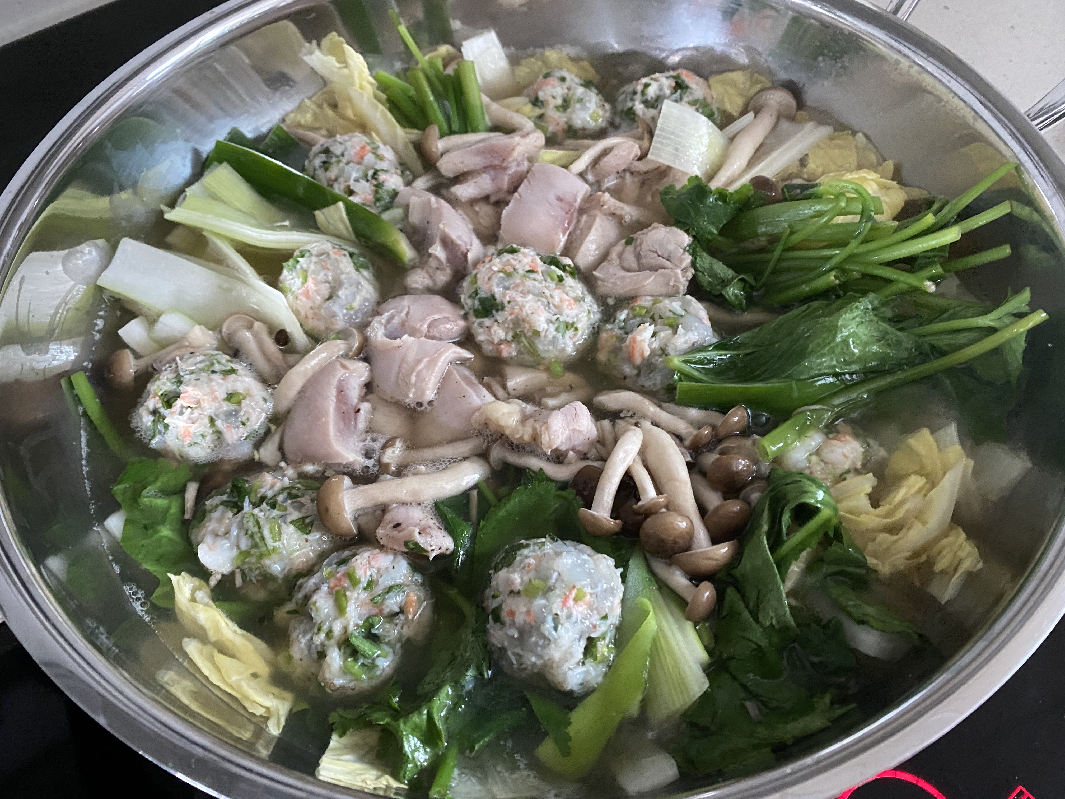분량의 다시 국물을 넣은 뒤 닭고기와 완자가 70% 정도 익었을 때