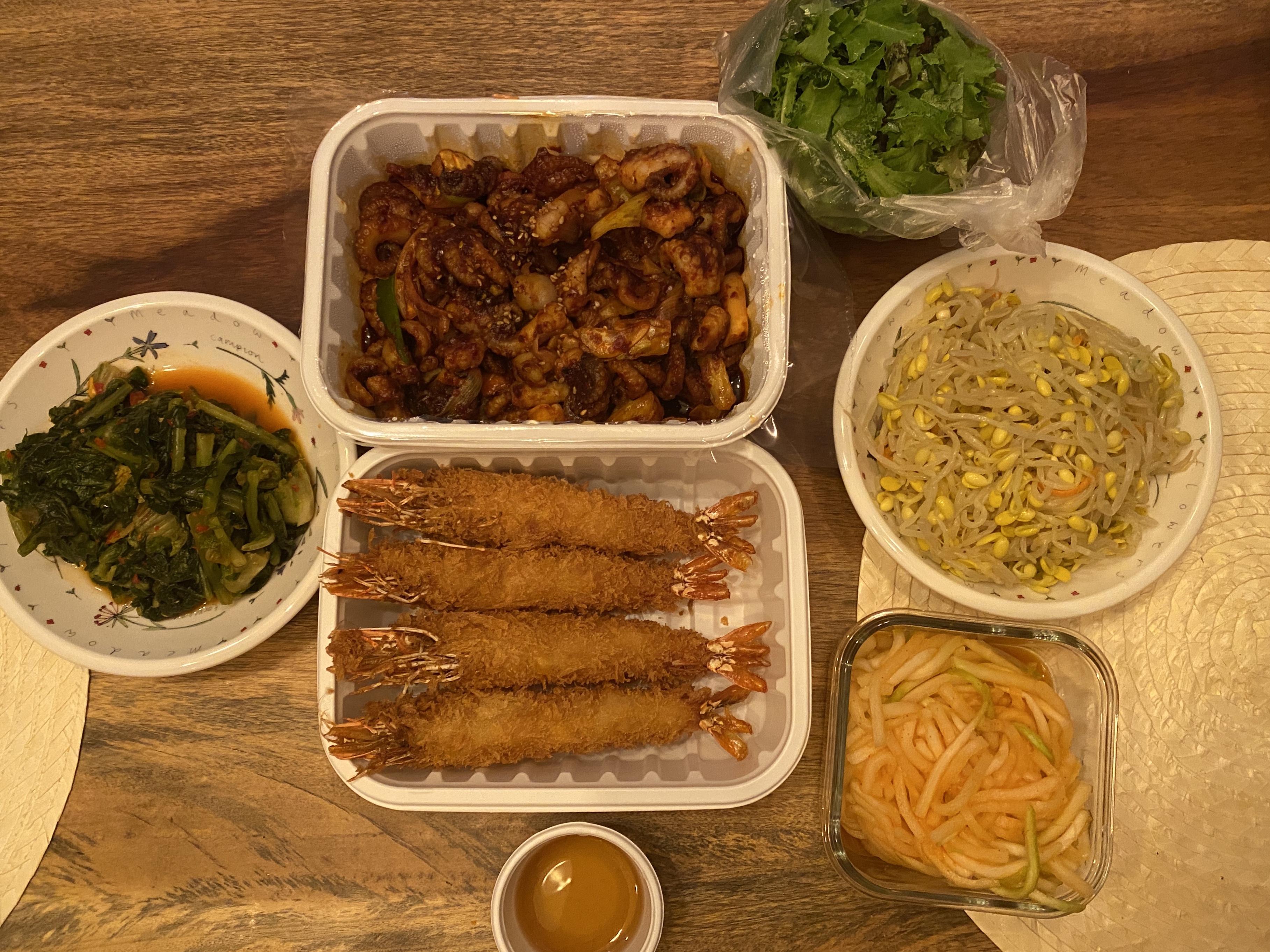 4인분 포장해 왔는데 열무, 무생채, 콩나물 무침 이렇게 딸려 온다.