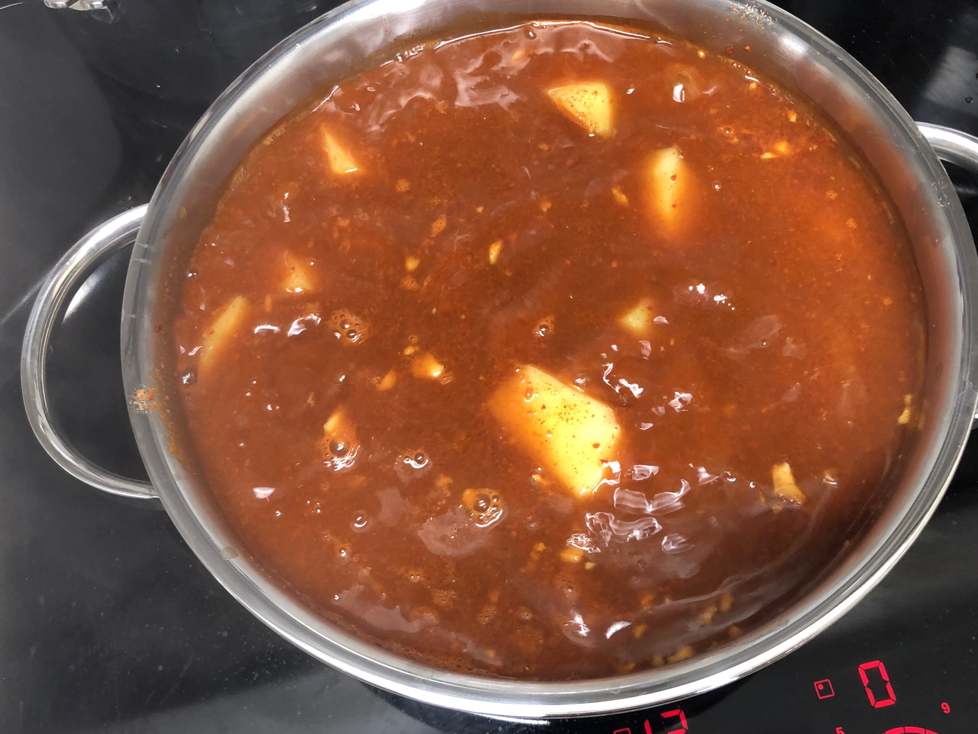 감자 넣고 멸치육수 넣고 양념 풀어서 감자를 익힌다.