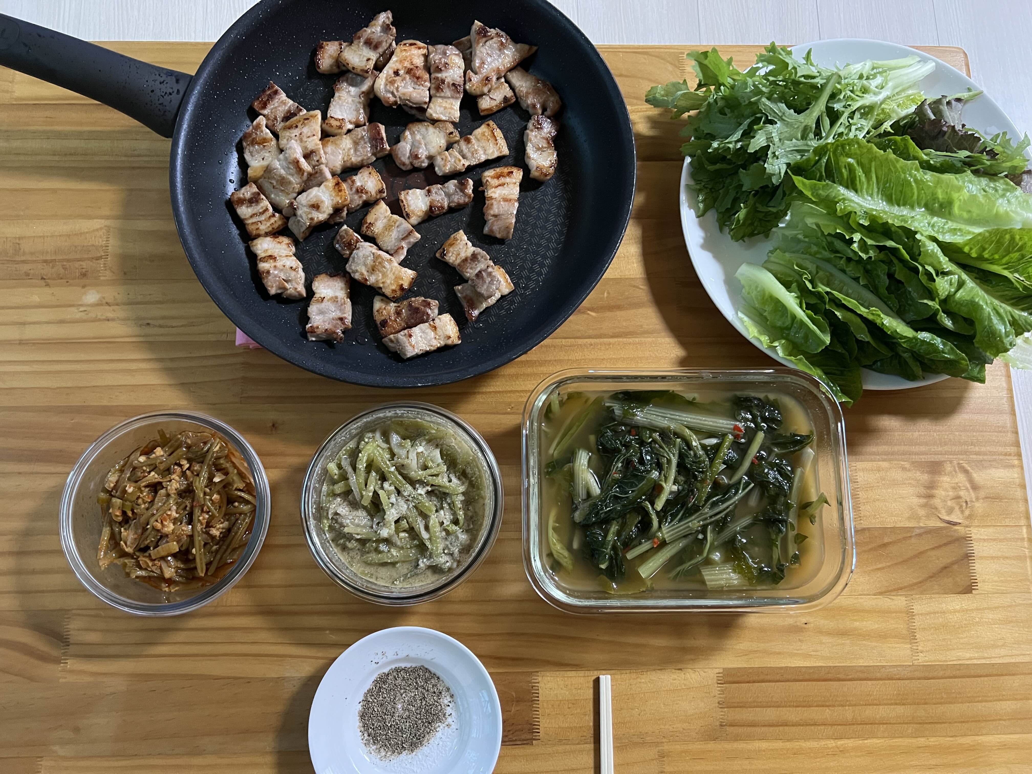 테라스에서 고기 좀 구워서 집에서 가져온 열무물김치, 고구마순 김치 등이랑 먹었다.