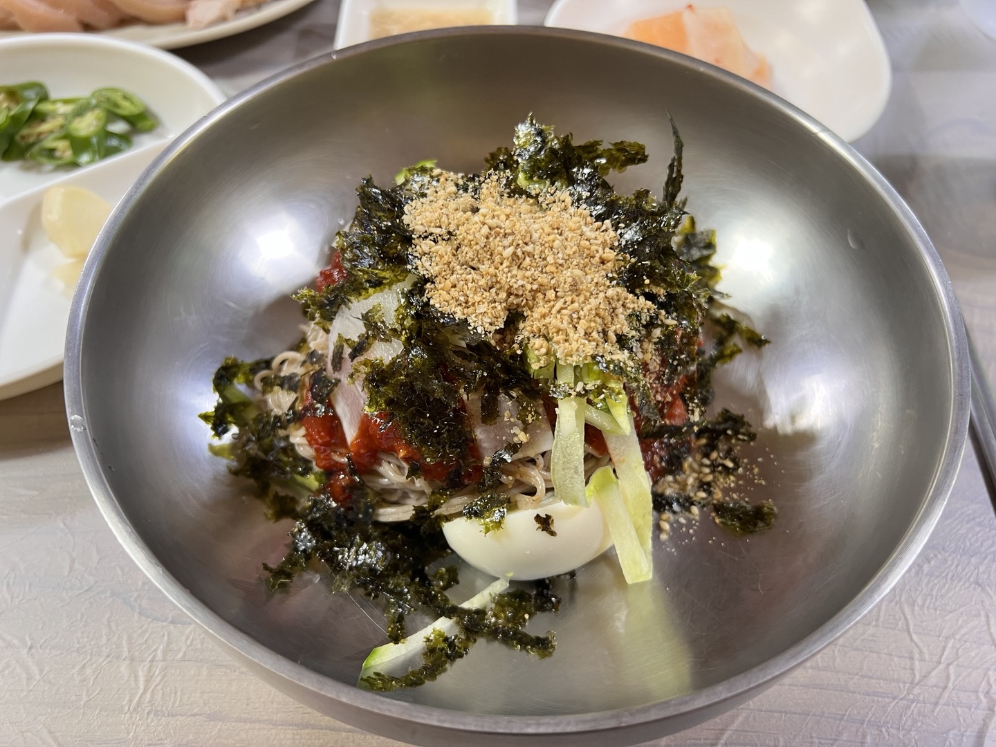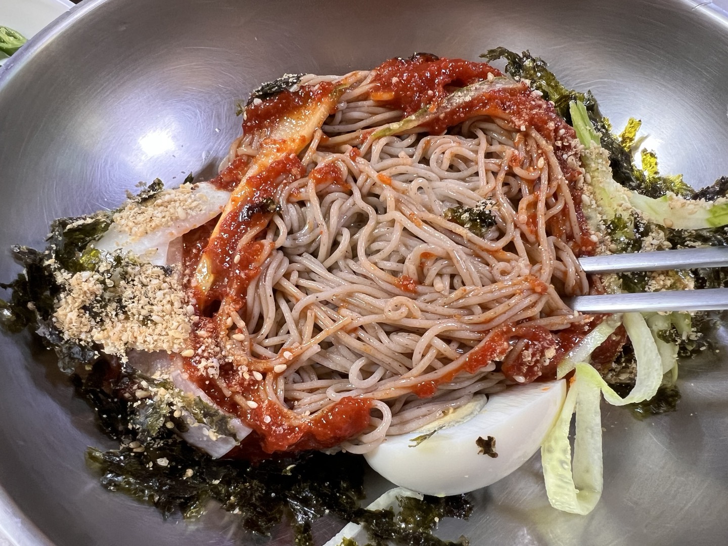 메밀함량이 높아 뚝뚝 끊어지며 메밀향이 고소하게 올라온다.