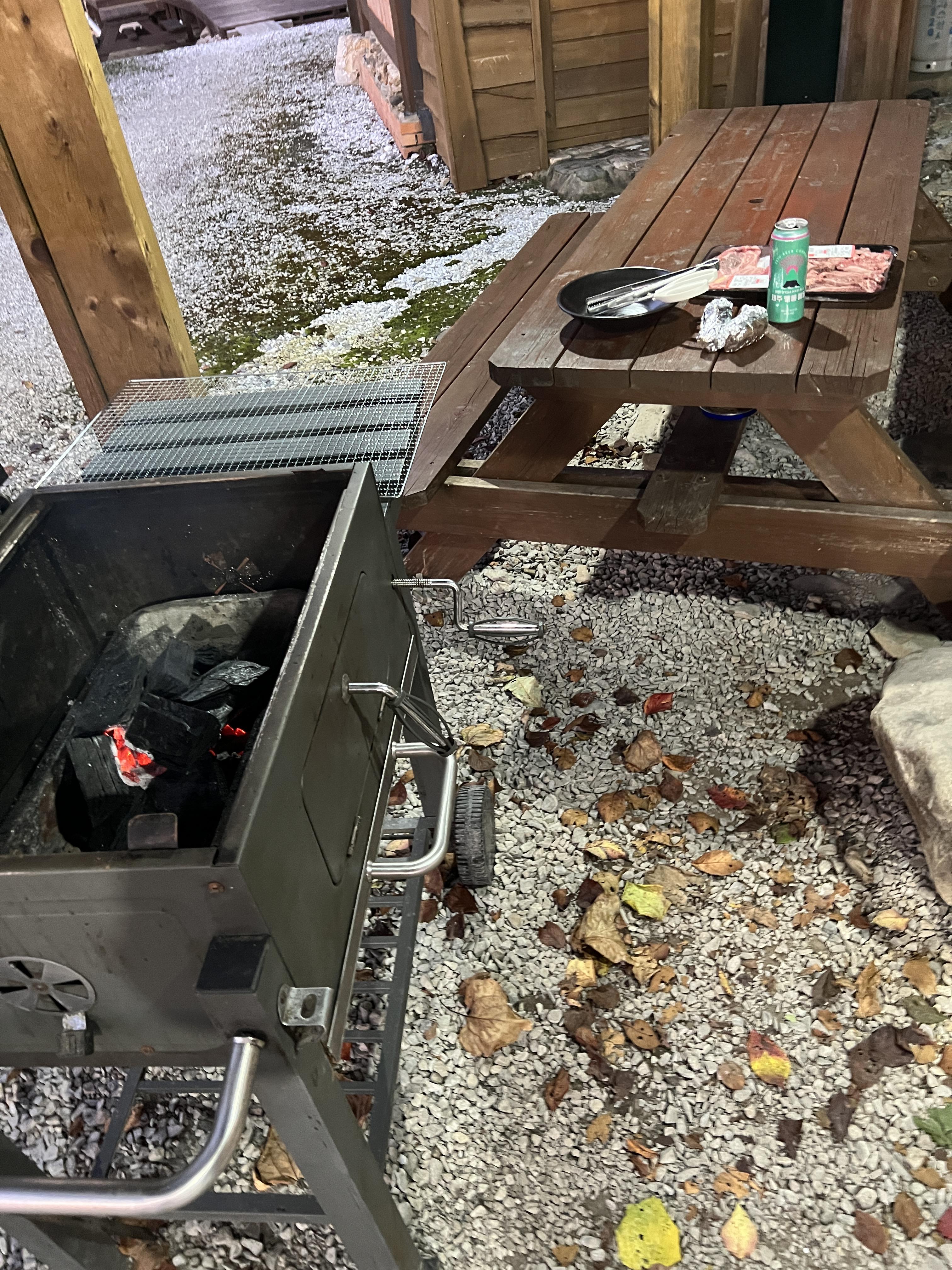 불피워주셔서 숯불에 고기를 구워 먹었다. 문 바로 앞이라 얼마나 편했는지 모른다.