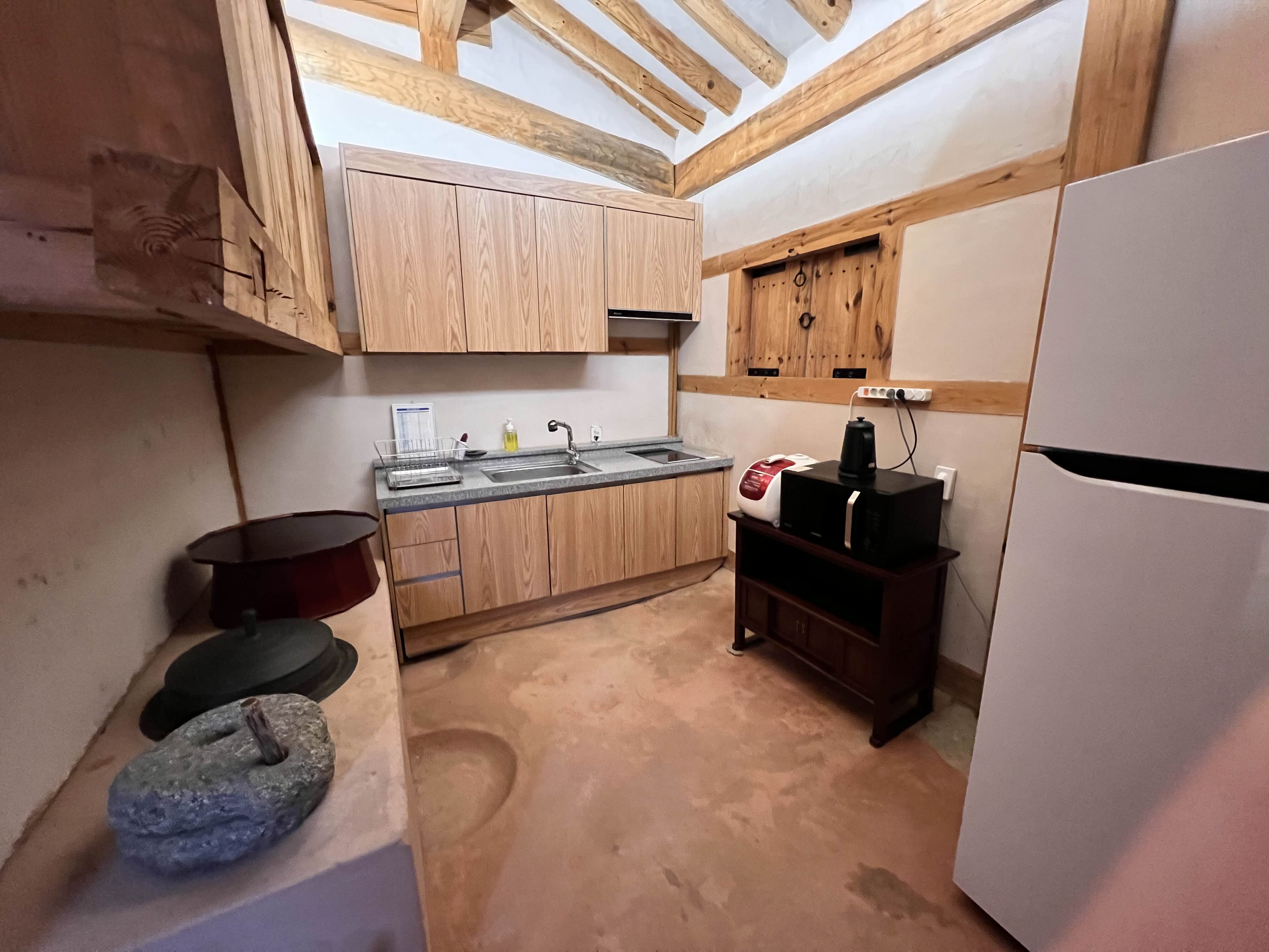 전자렌지, 전기주전자, 밥솥, 싱크대, 냉장고 전부 다 구비되어 있다.