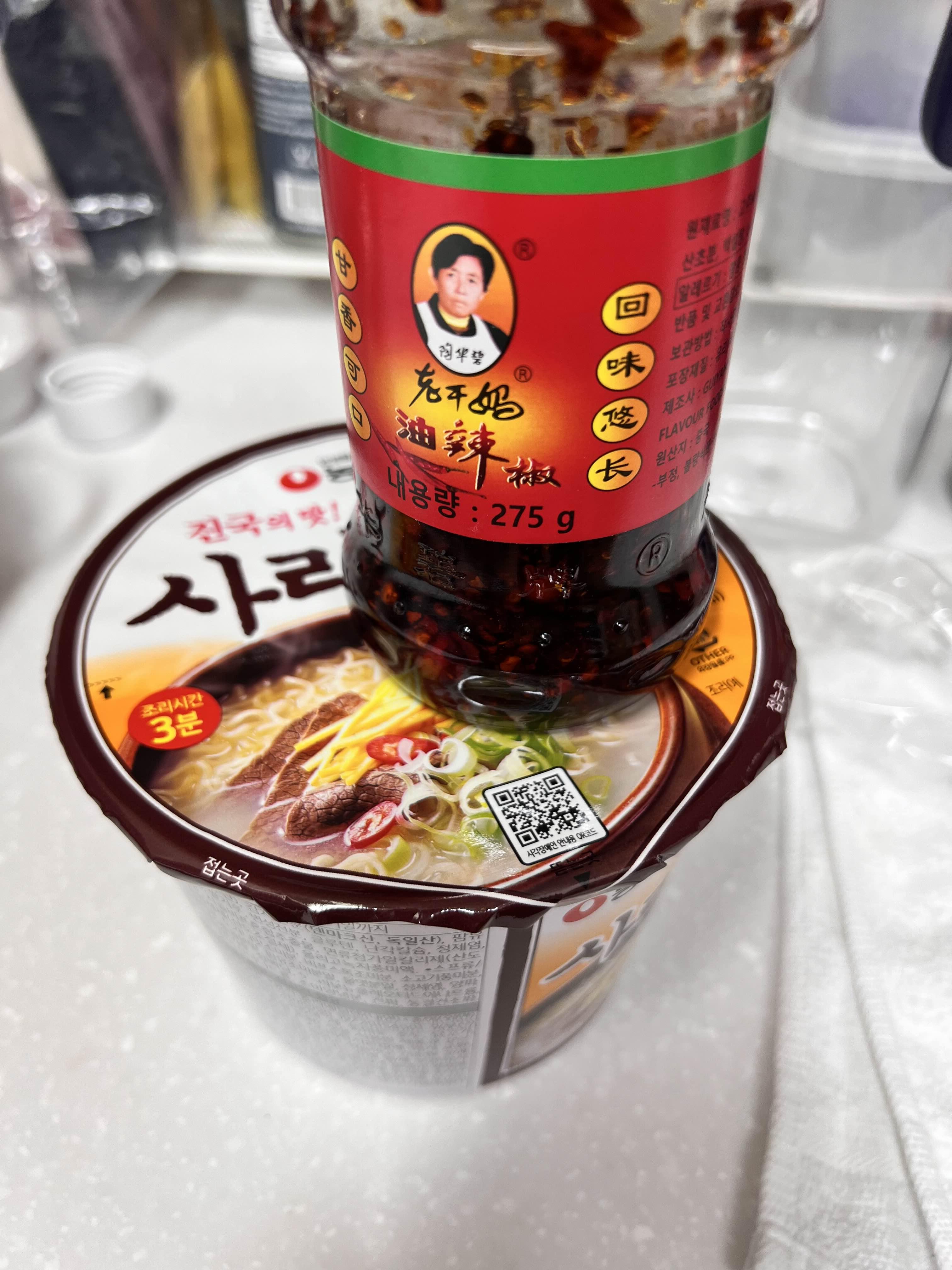 처음엔 사리곰탕면 스프 넣을 때 아예 라오간마 라조장을 밥 숟가락으로 한 스푼 정도 넣어 먹었다.