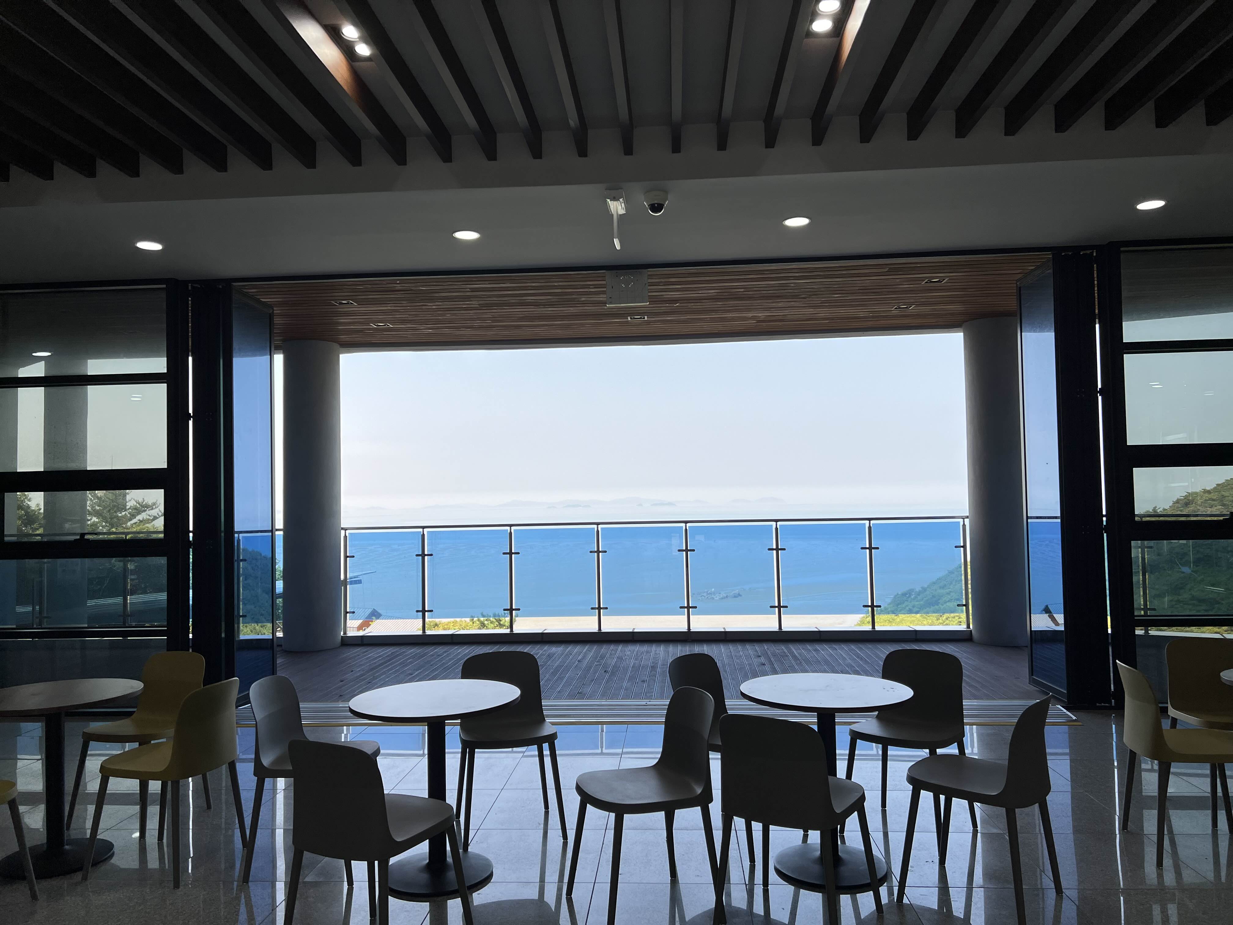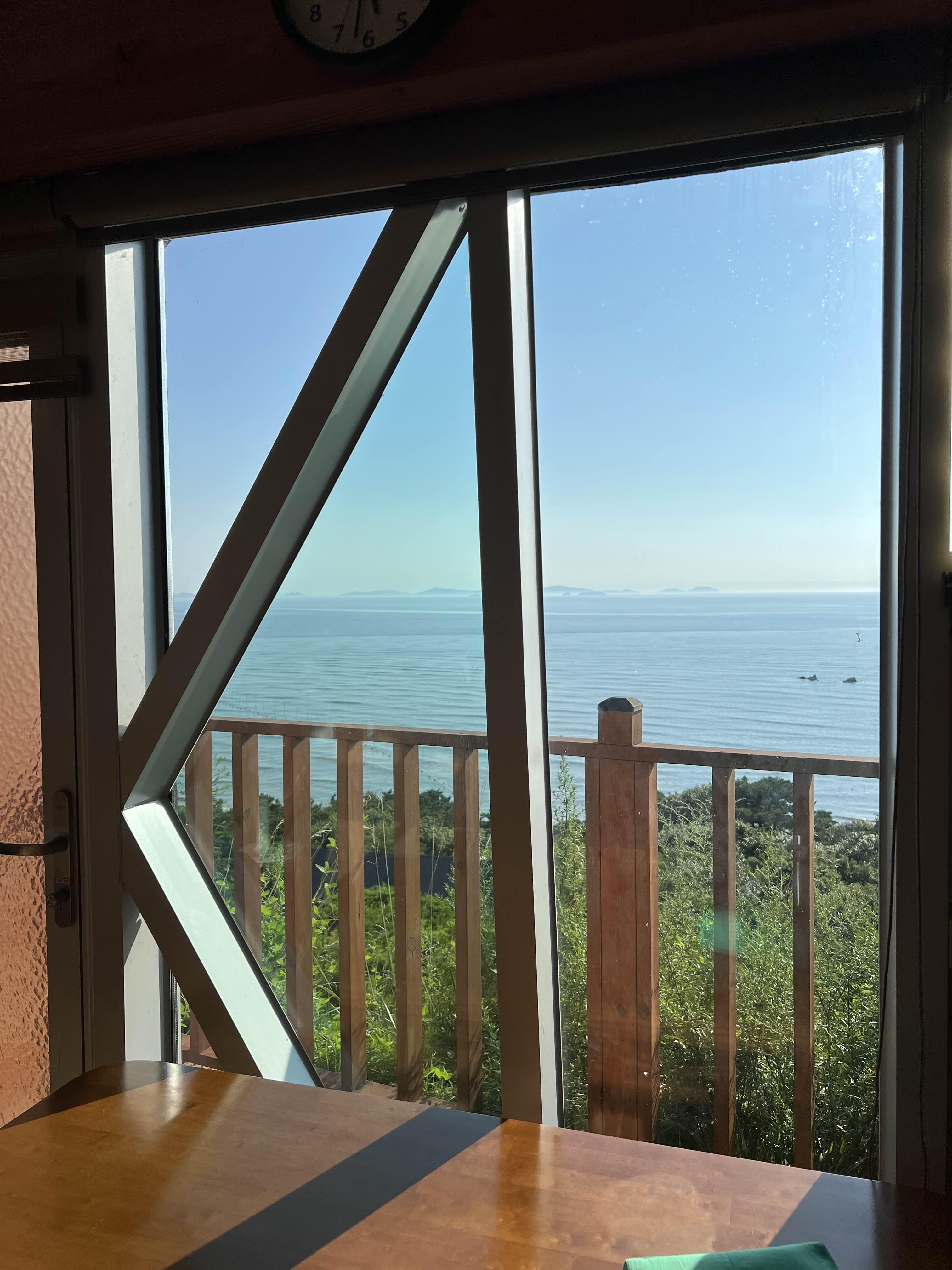 샤워하는데 바깥 바다가 보인다.