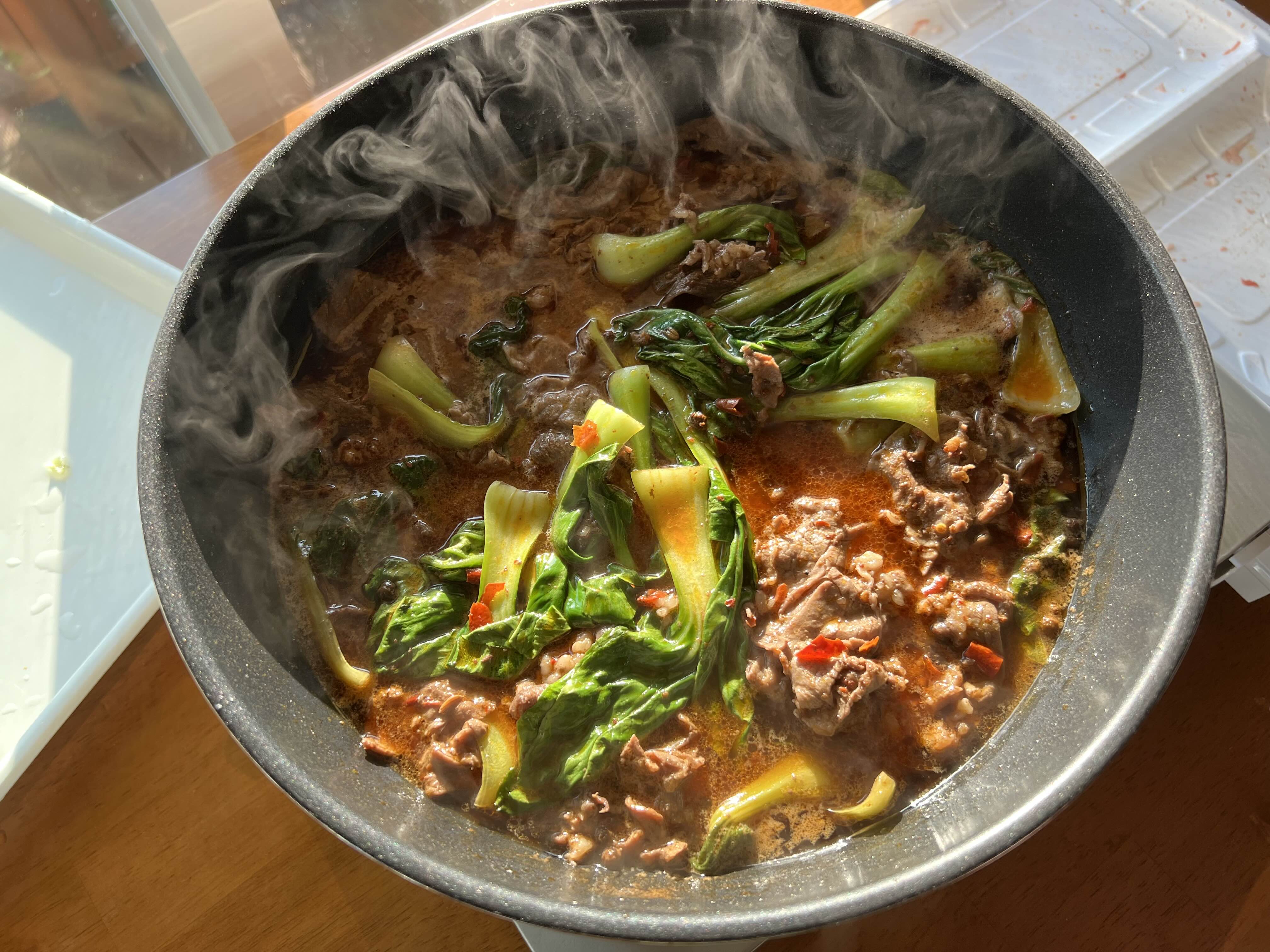 샤브소고기에 마라소스 넣어 끓였다. 청경채 듬뿍