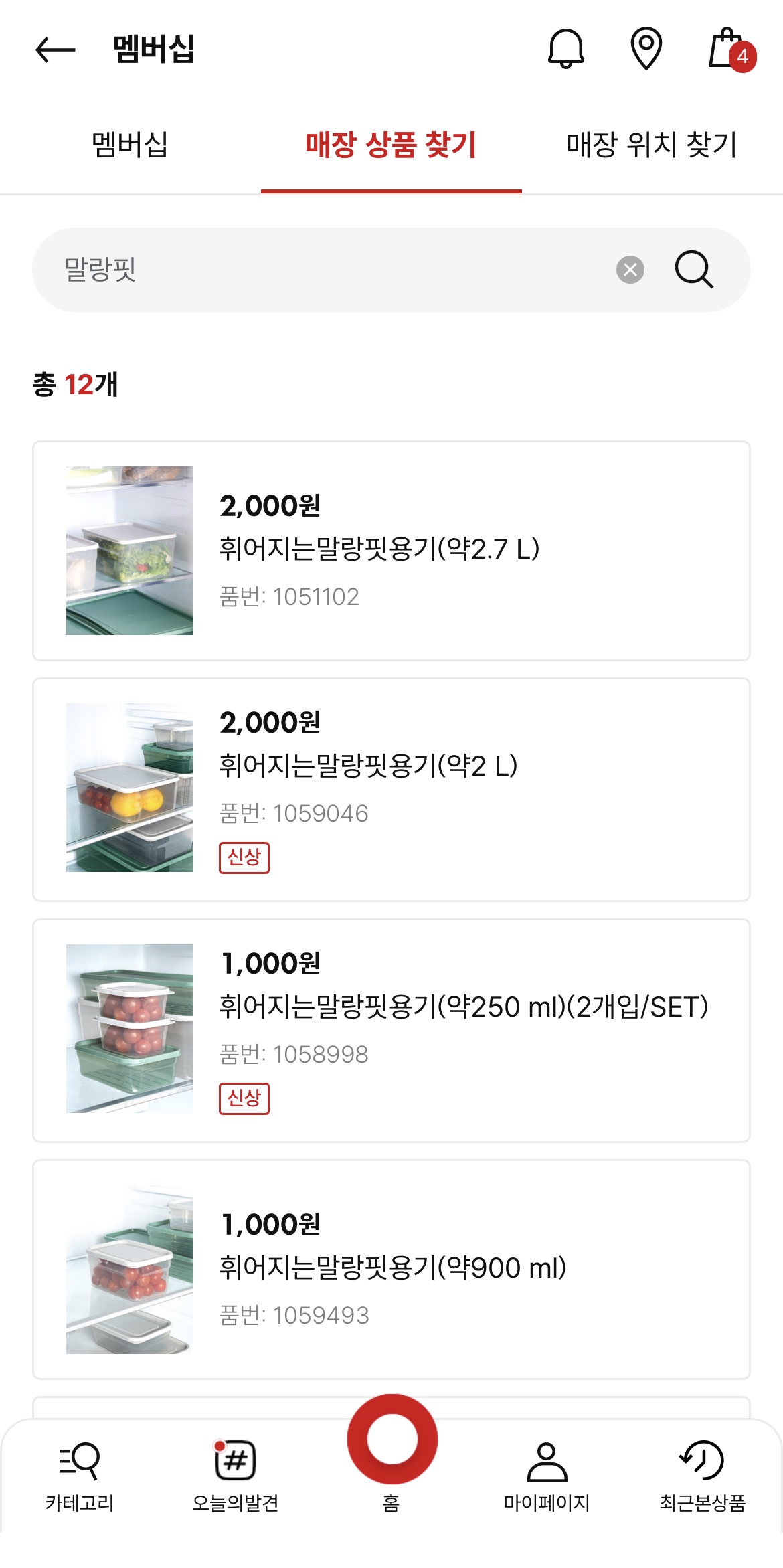1.3l와 2.7l 용기를 각각 6개 구매하였고, 냉장고 수납함 손잡이형 5호가 맞다고 하여 5호도 구입했다.
