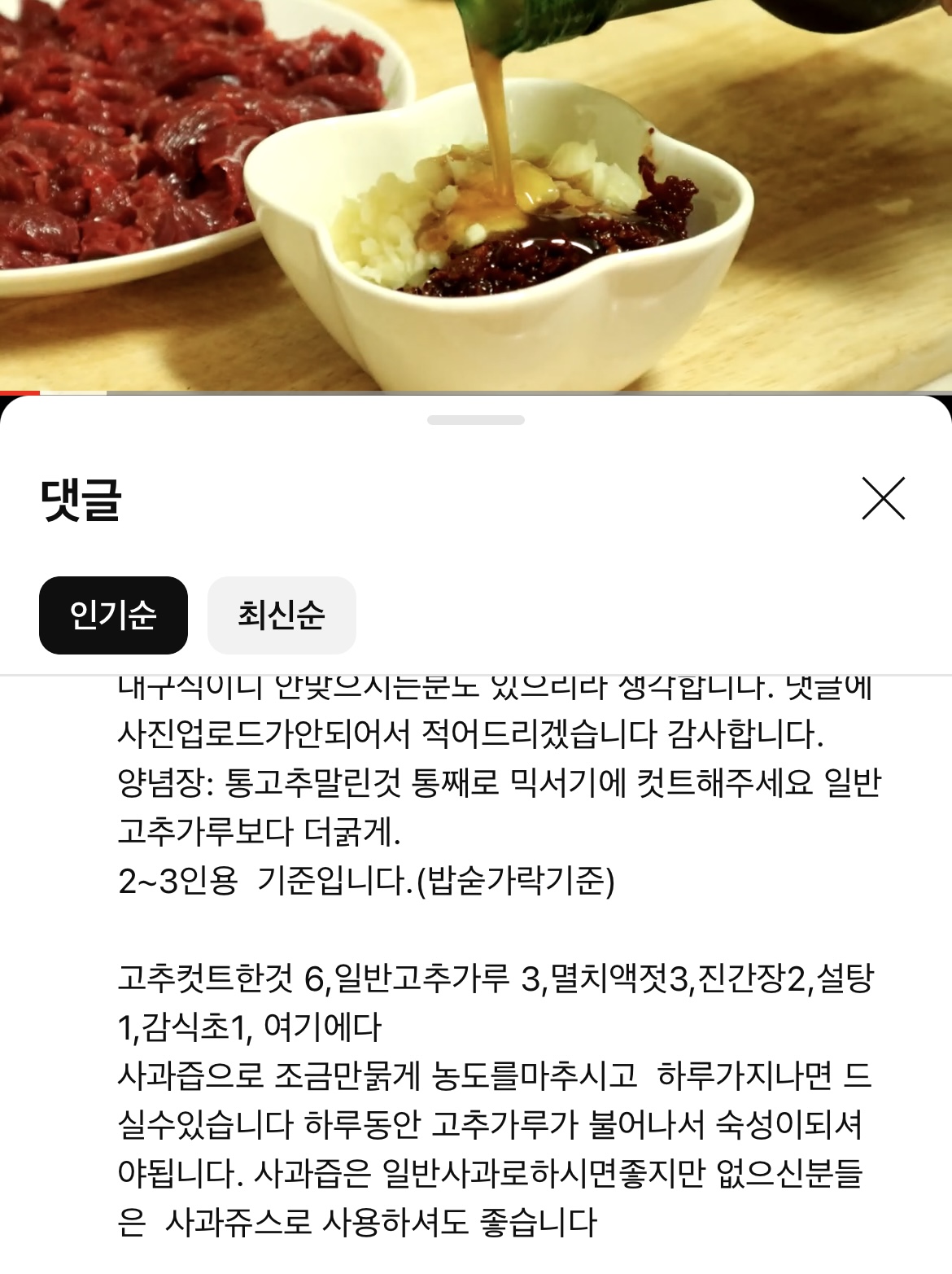 내가 참고한 레시피 댓글이다