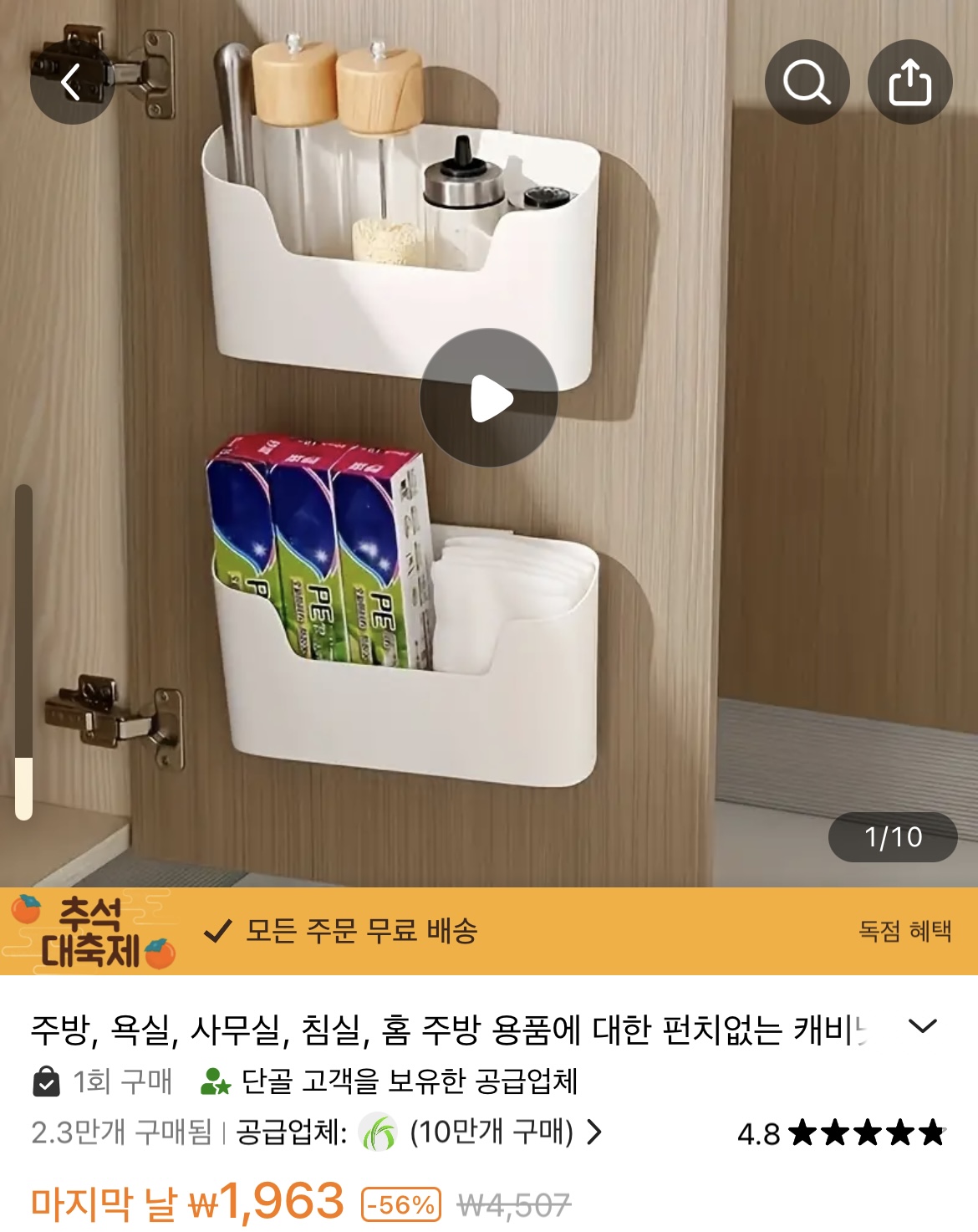 부착식 수납함이고, 수납함이 얇고 가벼워 활용도가 높아 보였다.