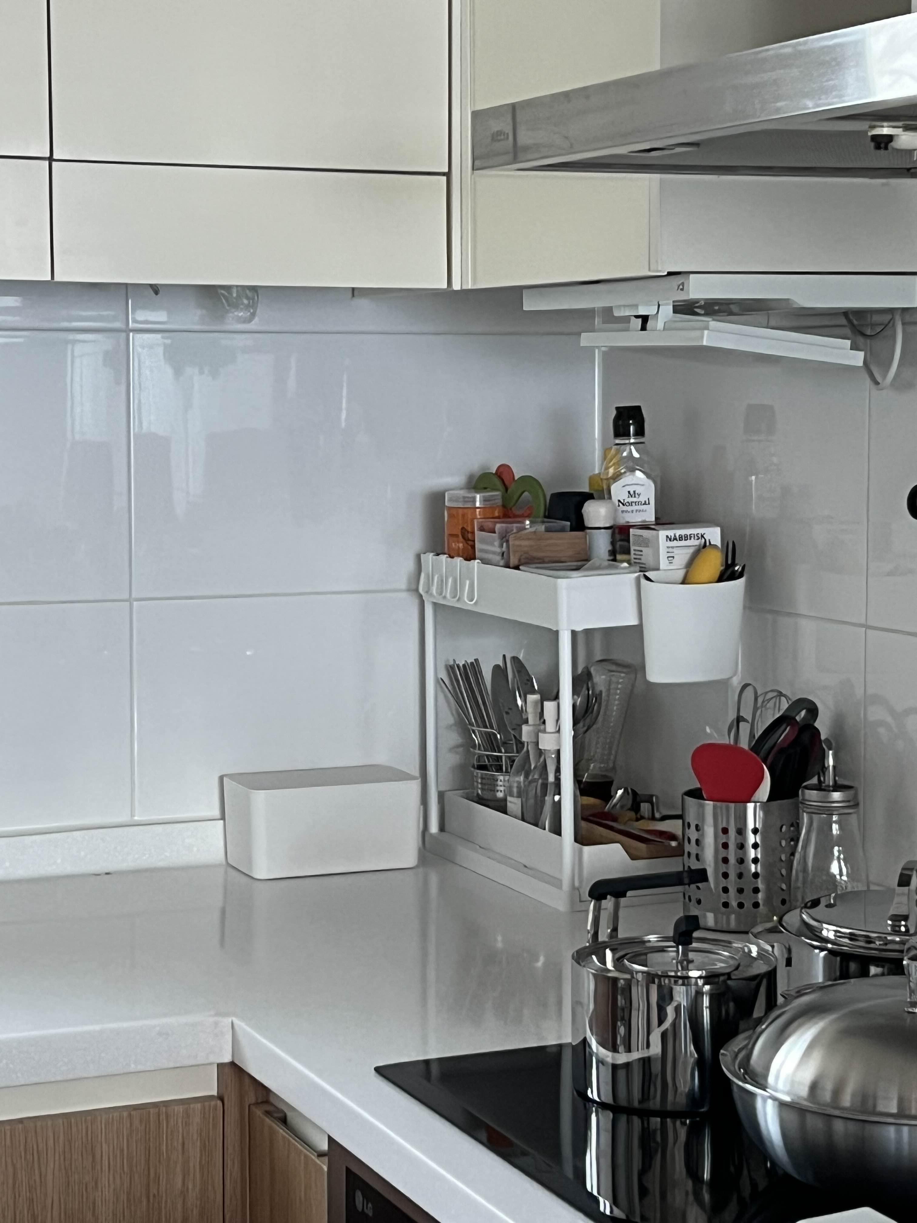 싱크대 안에 둘 곳이 없어서 싱크대 위에 놓고 잡다하게 널부러져 있던 것들을 모아 정리해 줬다.