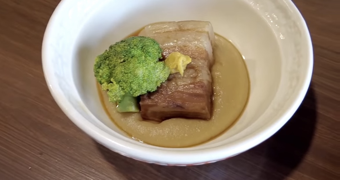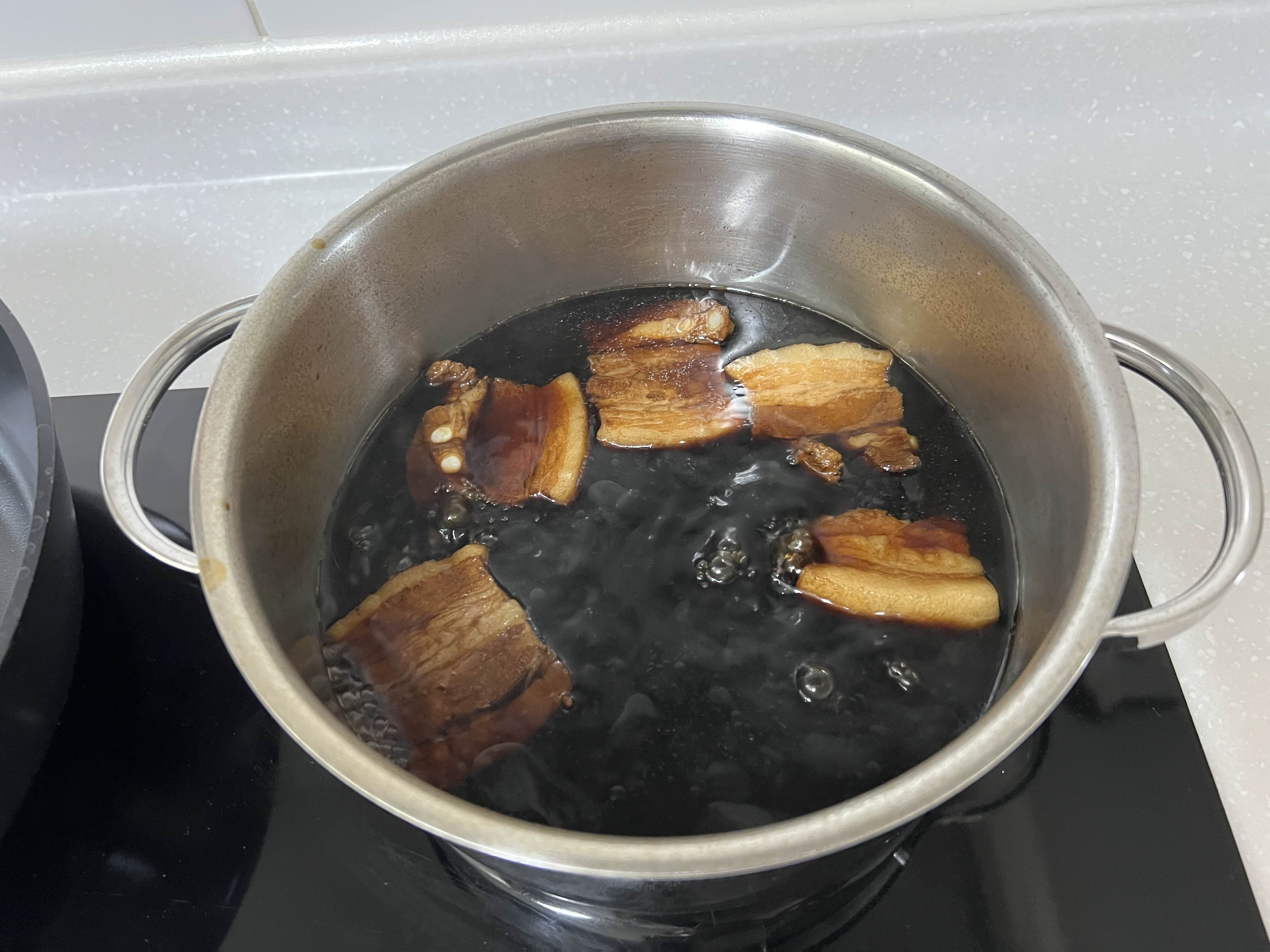 돼지고기 삼겹살을 콩물에서 익힌 후 조림국물에 조린다