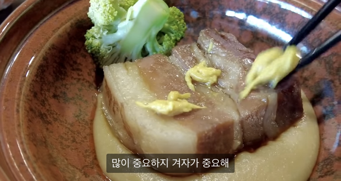 옆 냄비에서 고기 하나 얹고 연겨자 올렸다.