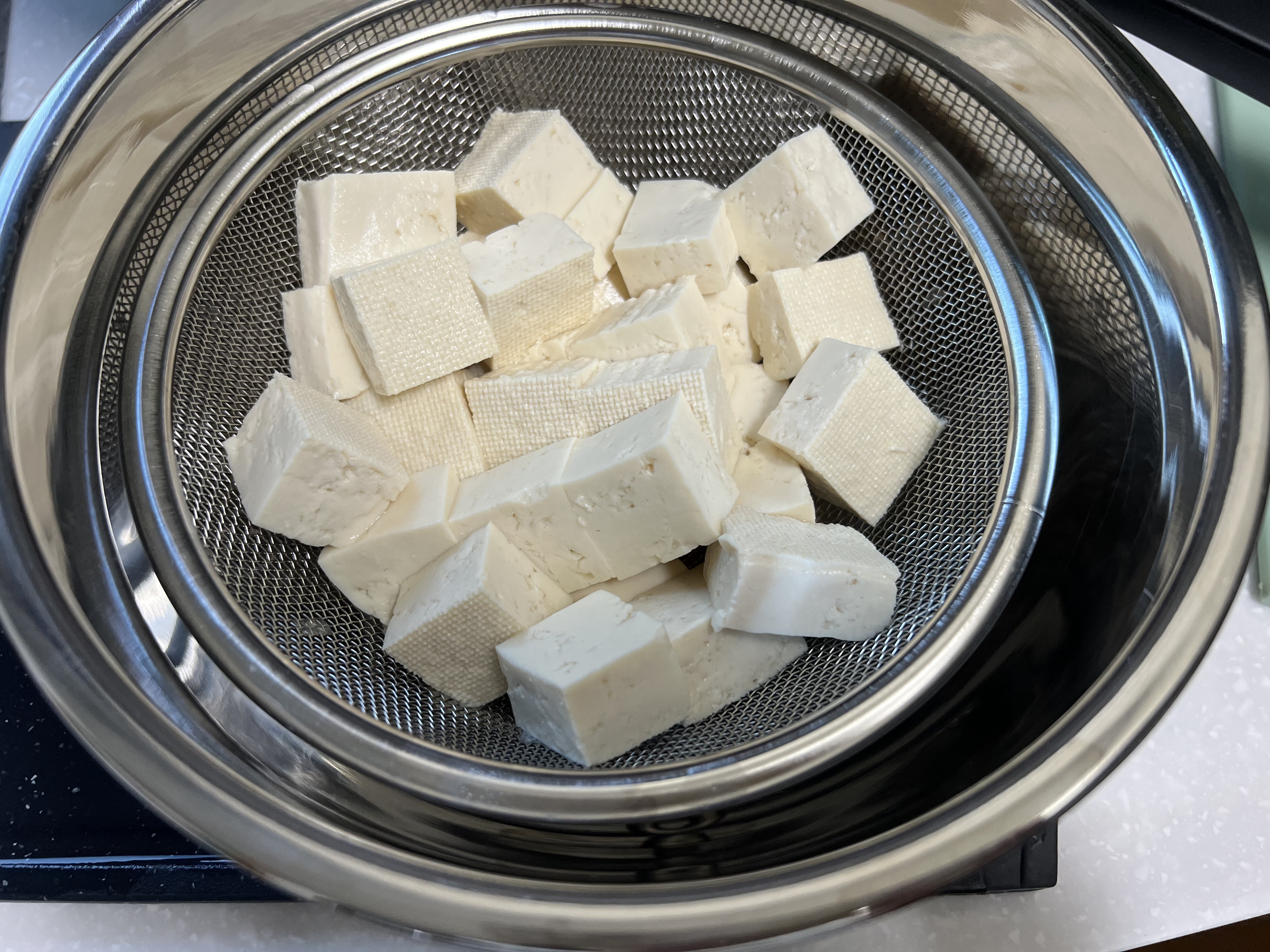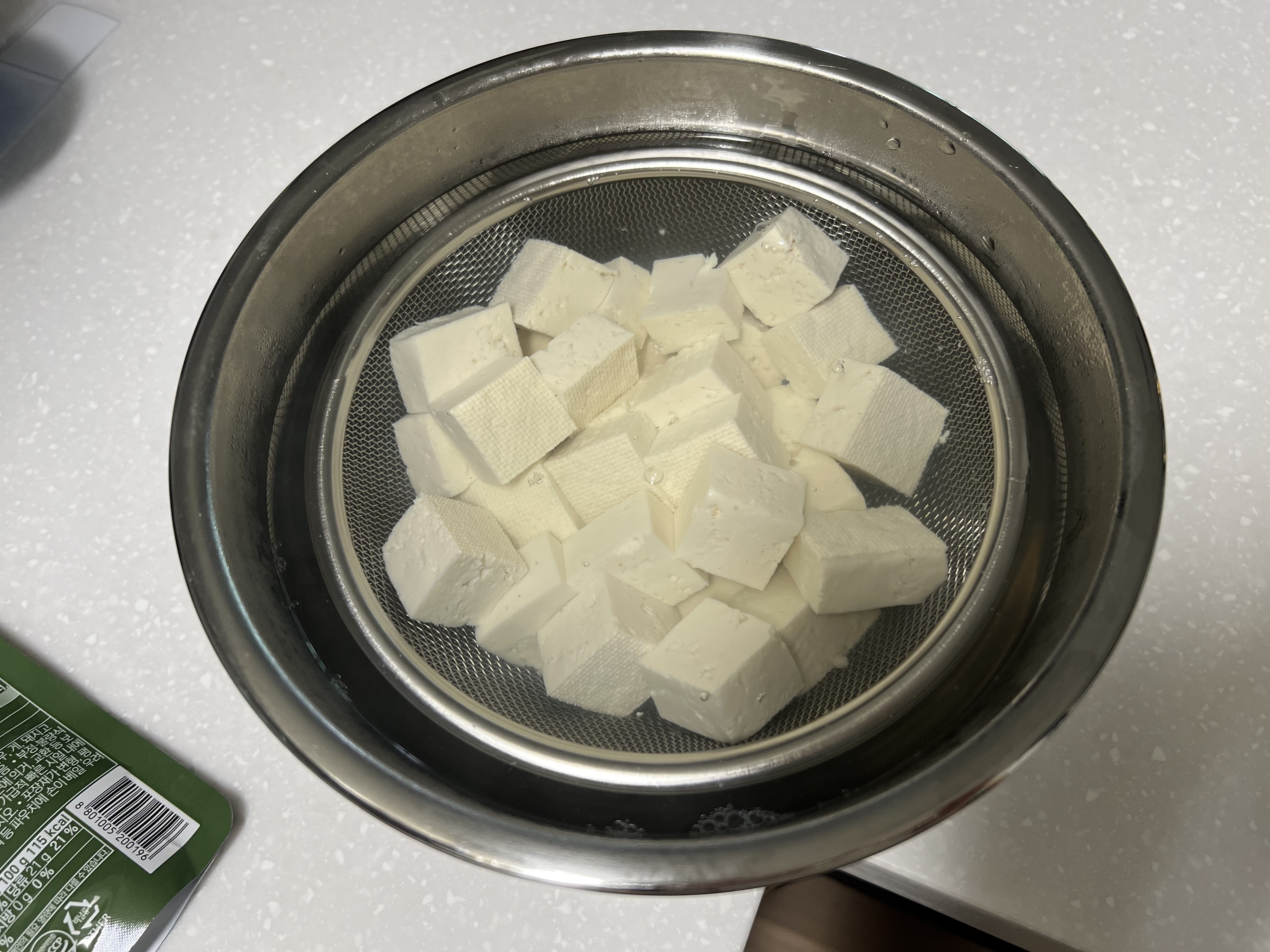 그래서 뜨거운 물을 부어 살짝 데쳐 두부 내 머금은 물기를 좀 빼주는 것이다. 이렇게 하면 양념이 덜 돌아다니고 두부 속까지 양념맛을 더 많이 느낄 수 있다.