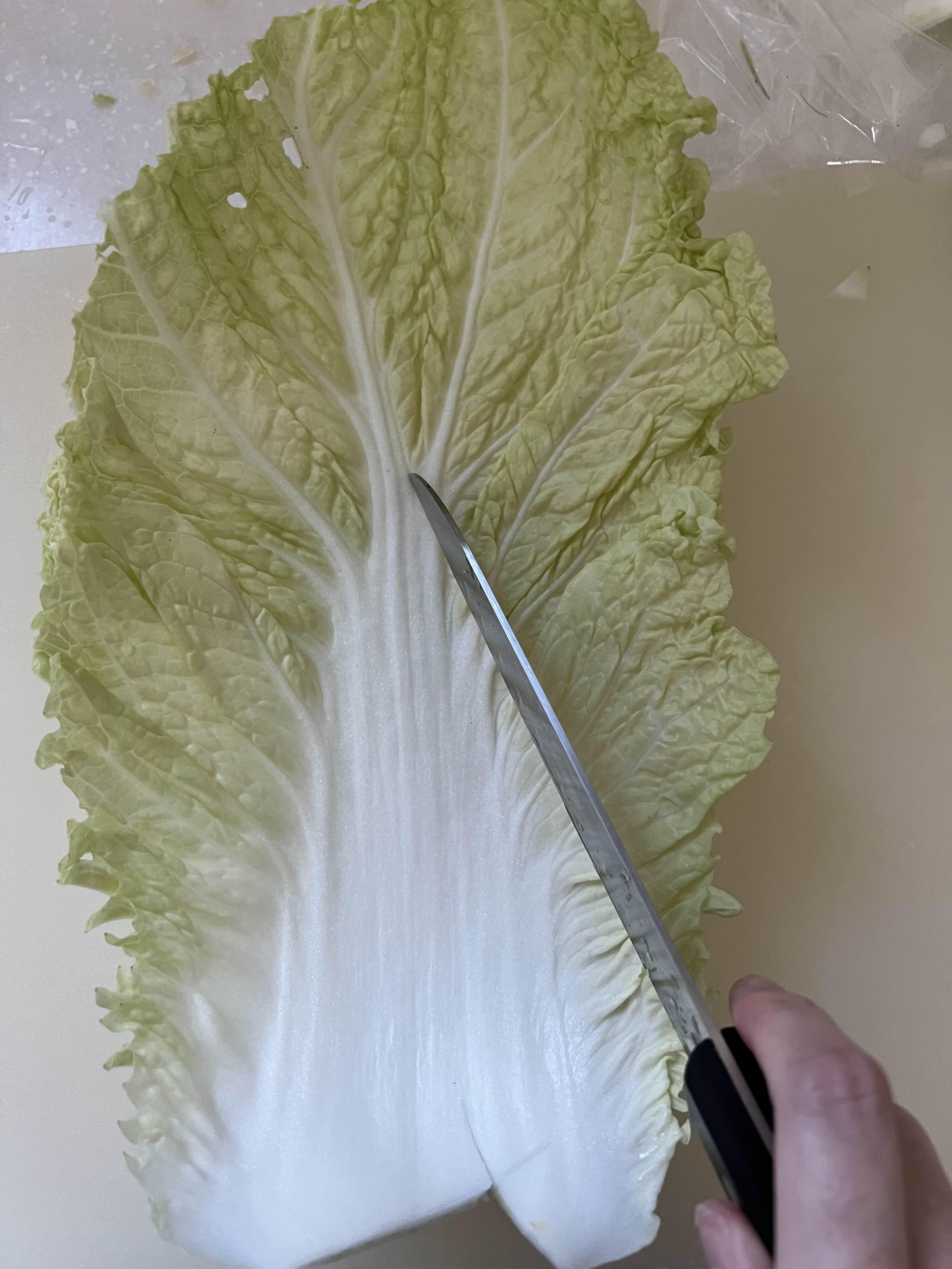 나처럼 하지 않고 위 사진처럼 세로로 배추를 이등분 한 후, 사선으로 잘라줘도 된다.