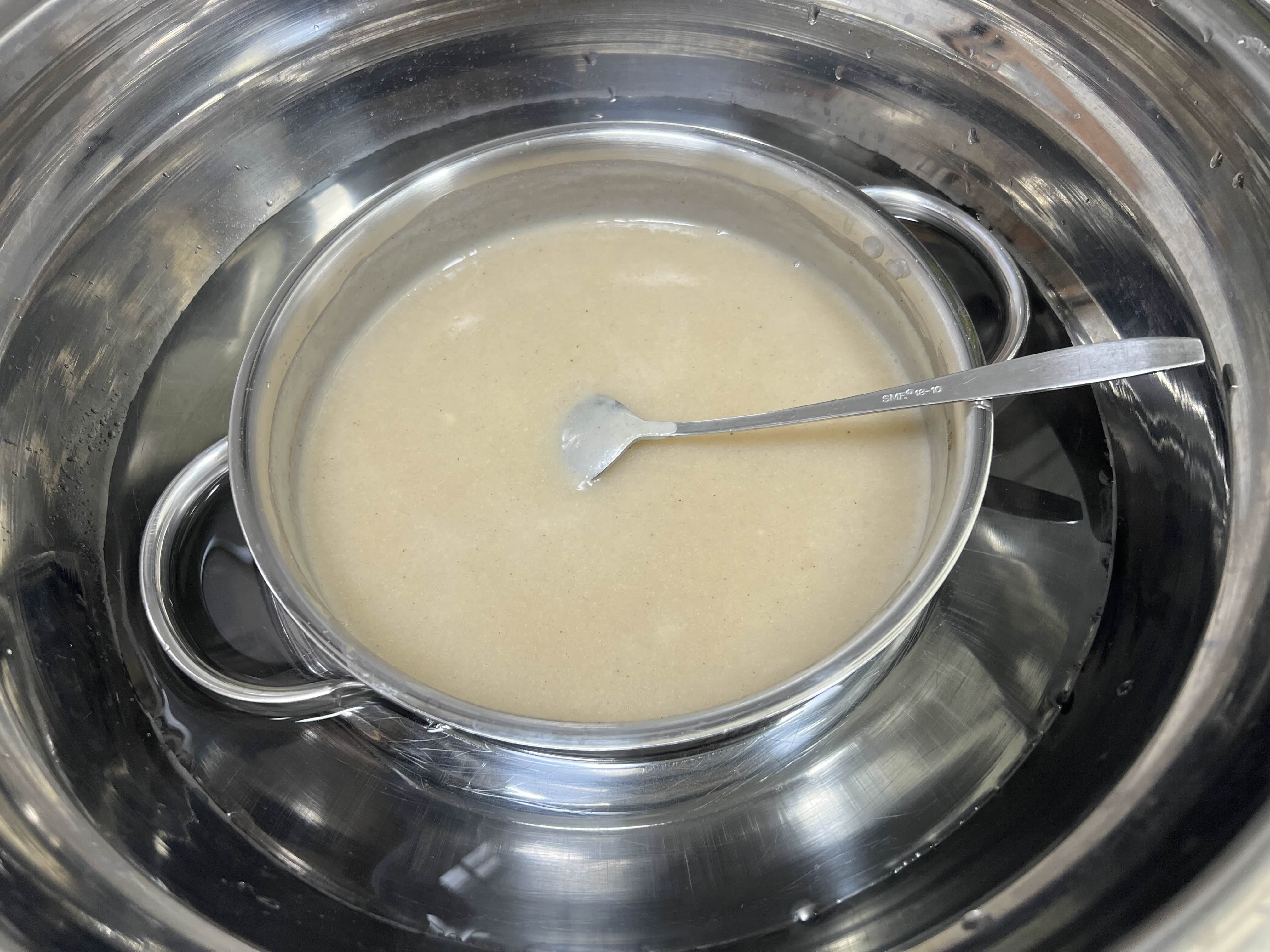 미리 끓여 완전히 식힌 육수 2컵에 찹쌀가루 4T 넣고 풀을 먼저 쑨다.