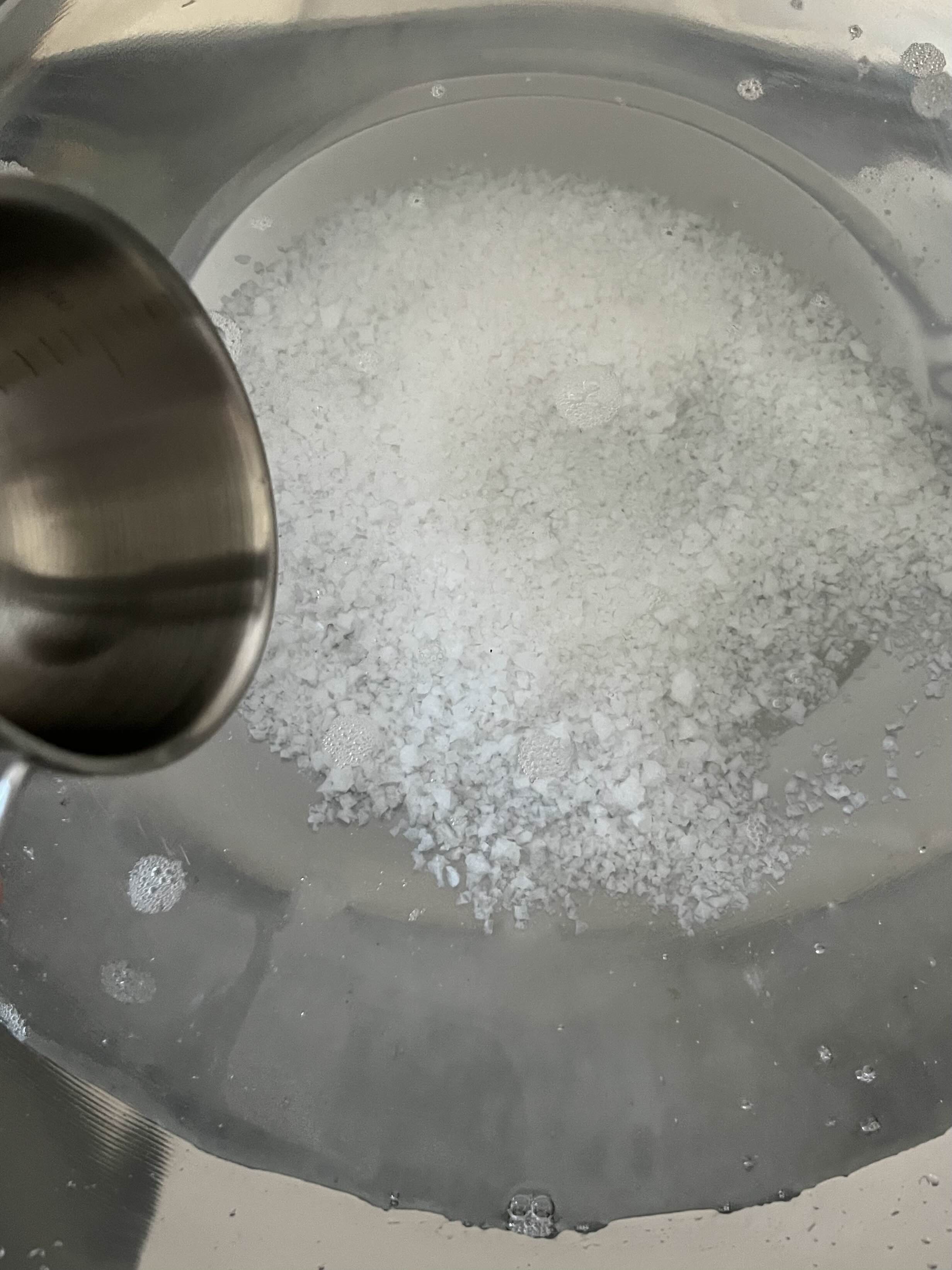 소금은 물에서 절대 저절로 녹지 않으므로, 손으로 휘휘 저어 소금을 물에 완전히 녹여준다. (tmi: 설탕의 경우도 인력으로 저어 녹여줘야 함)