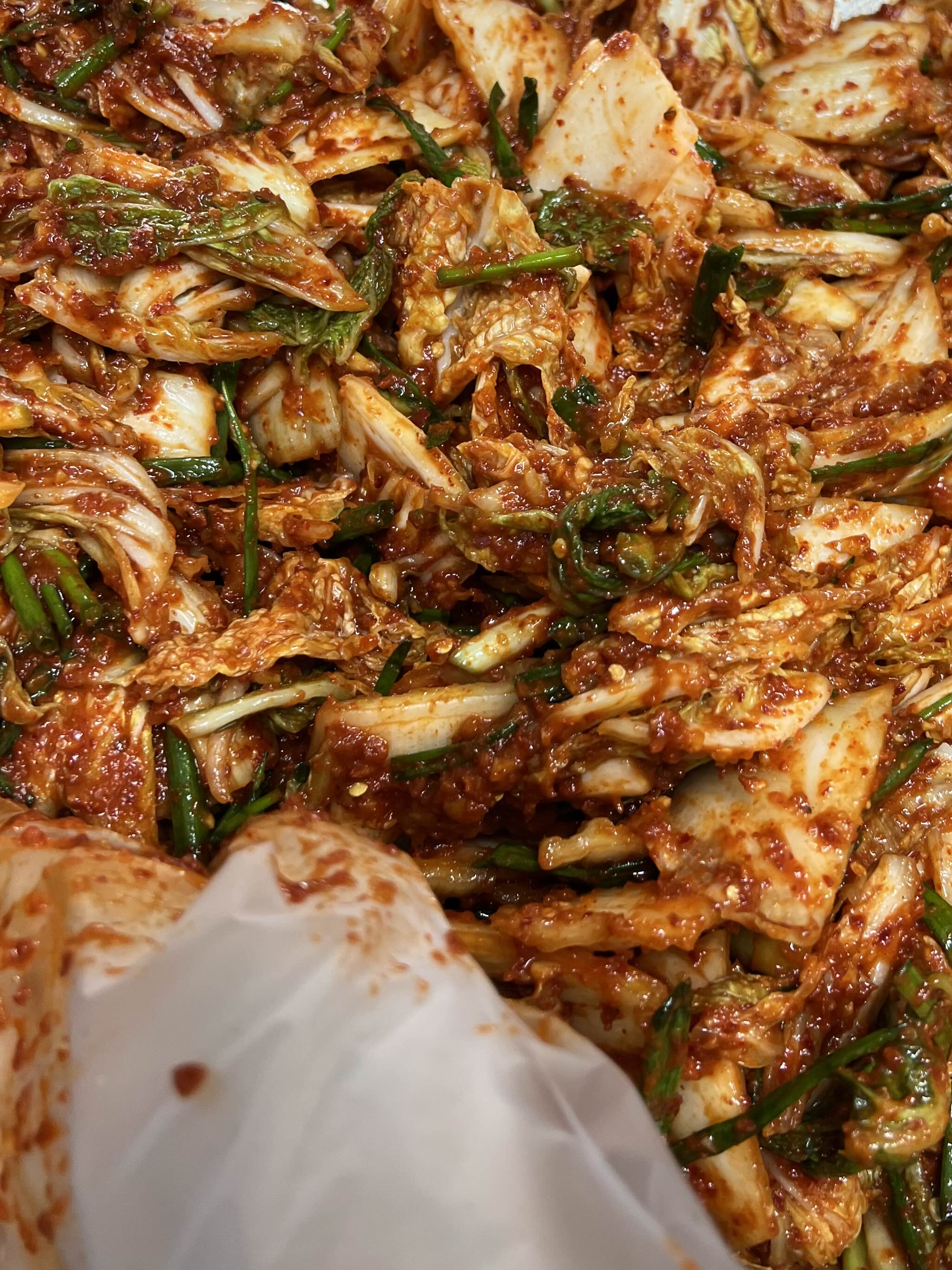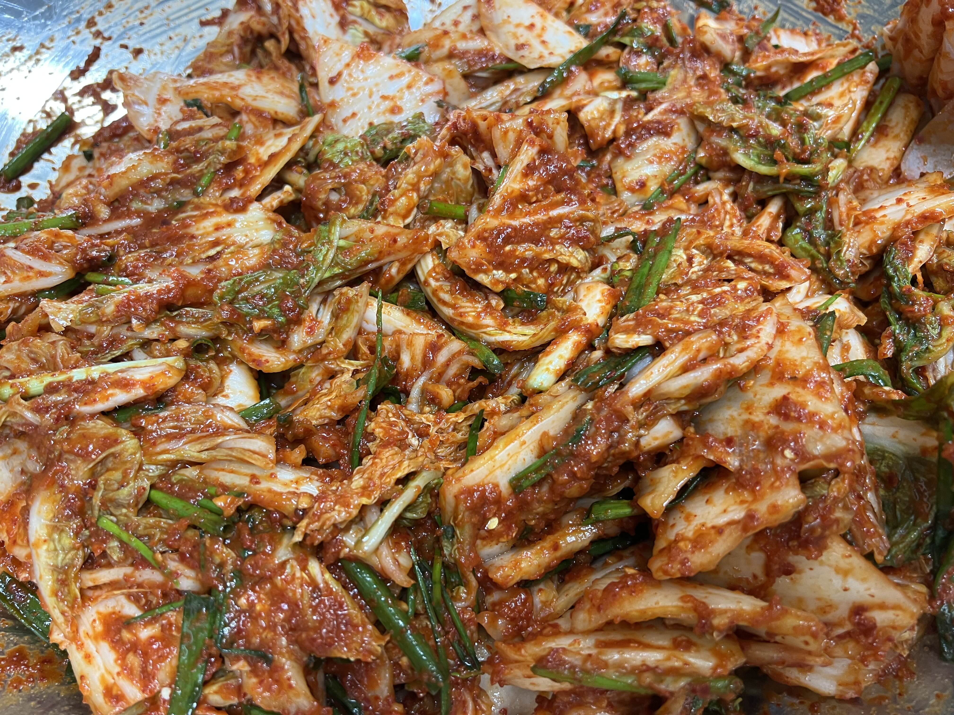 * 헹군다는 것: 바락바락 씻는 게 아니고, 받아둔 물에 배추들을 물에 담궈 첨벙첨벙 해주는 것. 이때 막 세척한다는 느낌으로 흐르는 물에 막 씻으면 절인배추가 물을 머금어서 배추 속으로 물이 재흡수되어 김치가 망하게 됨. 일명, ‘배추가 살아난다’는 말. 물을 다시 머금은 배추가 양념을 만나면 삼투압으로 배추 속 물이 다 나와서 배추는 물러지고 양념은 물이 넘쳐서 맹맛이 됨.