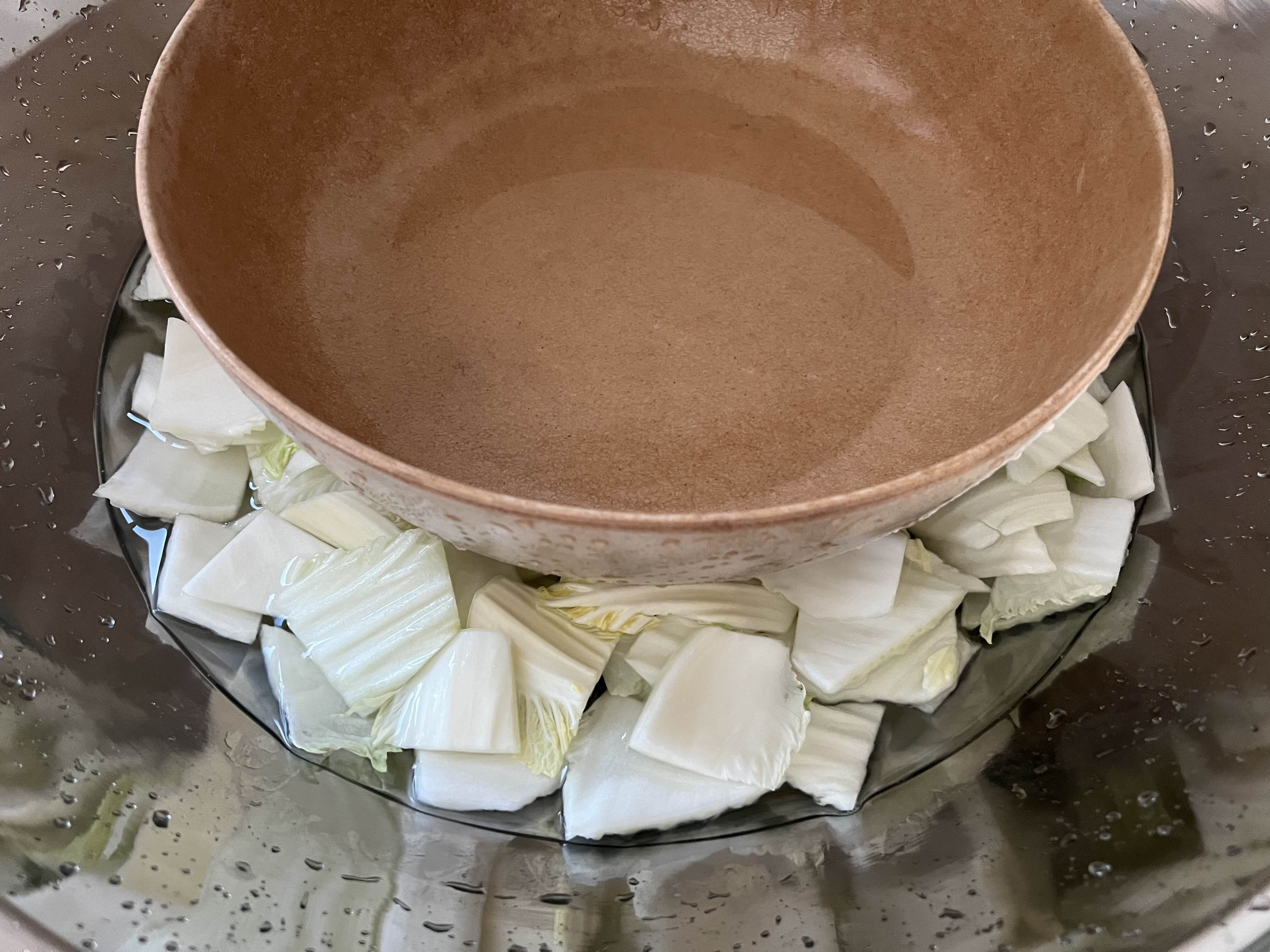 썬 배춧잎을 소금물에 넣고, 위에 약간의 무거운 물체를 얹어 준다. (배춧잎이 압력을 받아 밑부터 잘 절여지라고. 냄비나 큰접시 같은 것. 아주 안 무거워도 된다.)