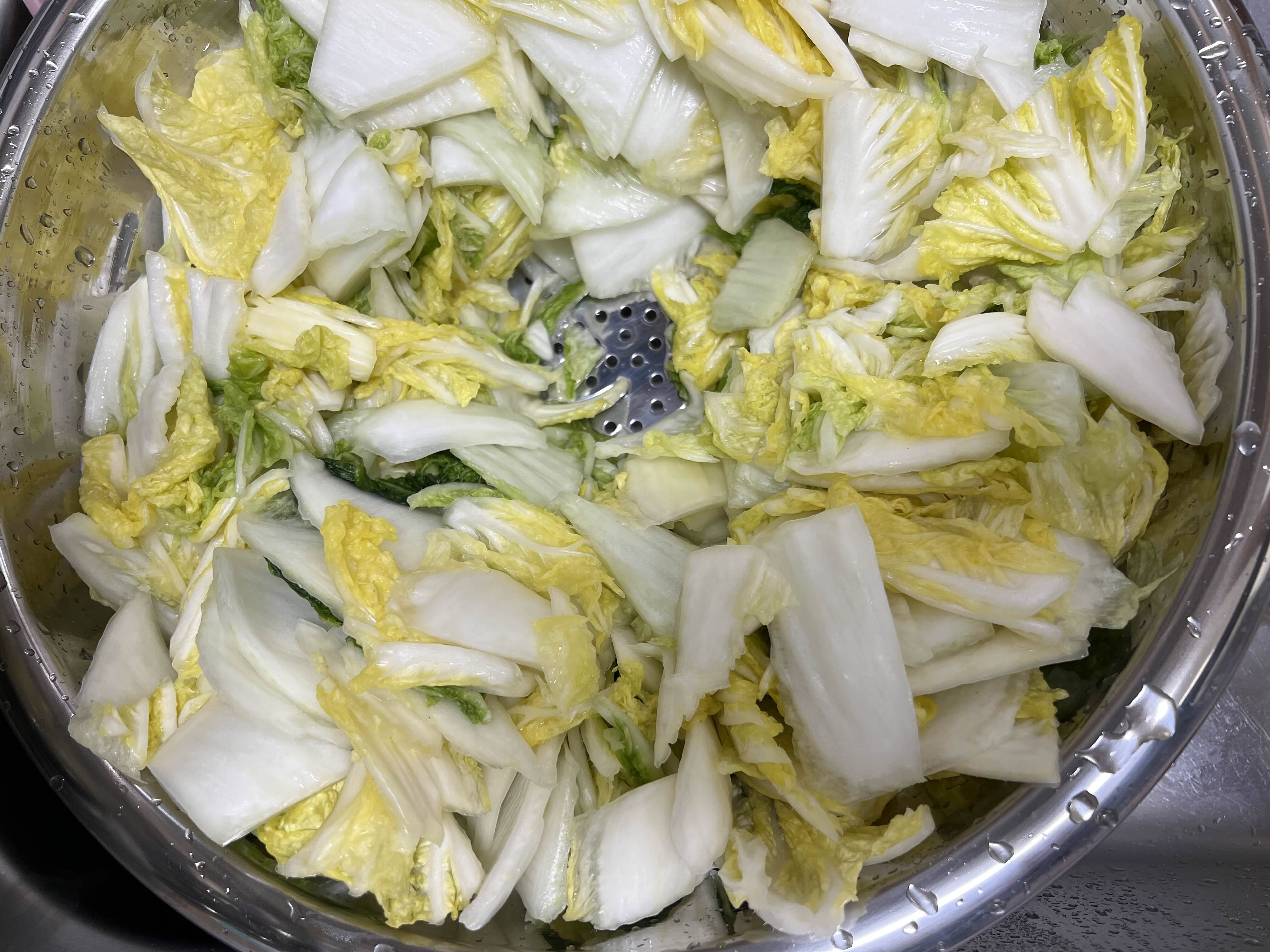 헹군 배추는 체에 받혀 물기를 충분히 빼준다. 최소 1시간. (1-2시간 물기가 빠지도록 놔둔다. 물기가 많으면 배추가 무르고 맛이 없다.)