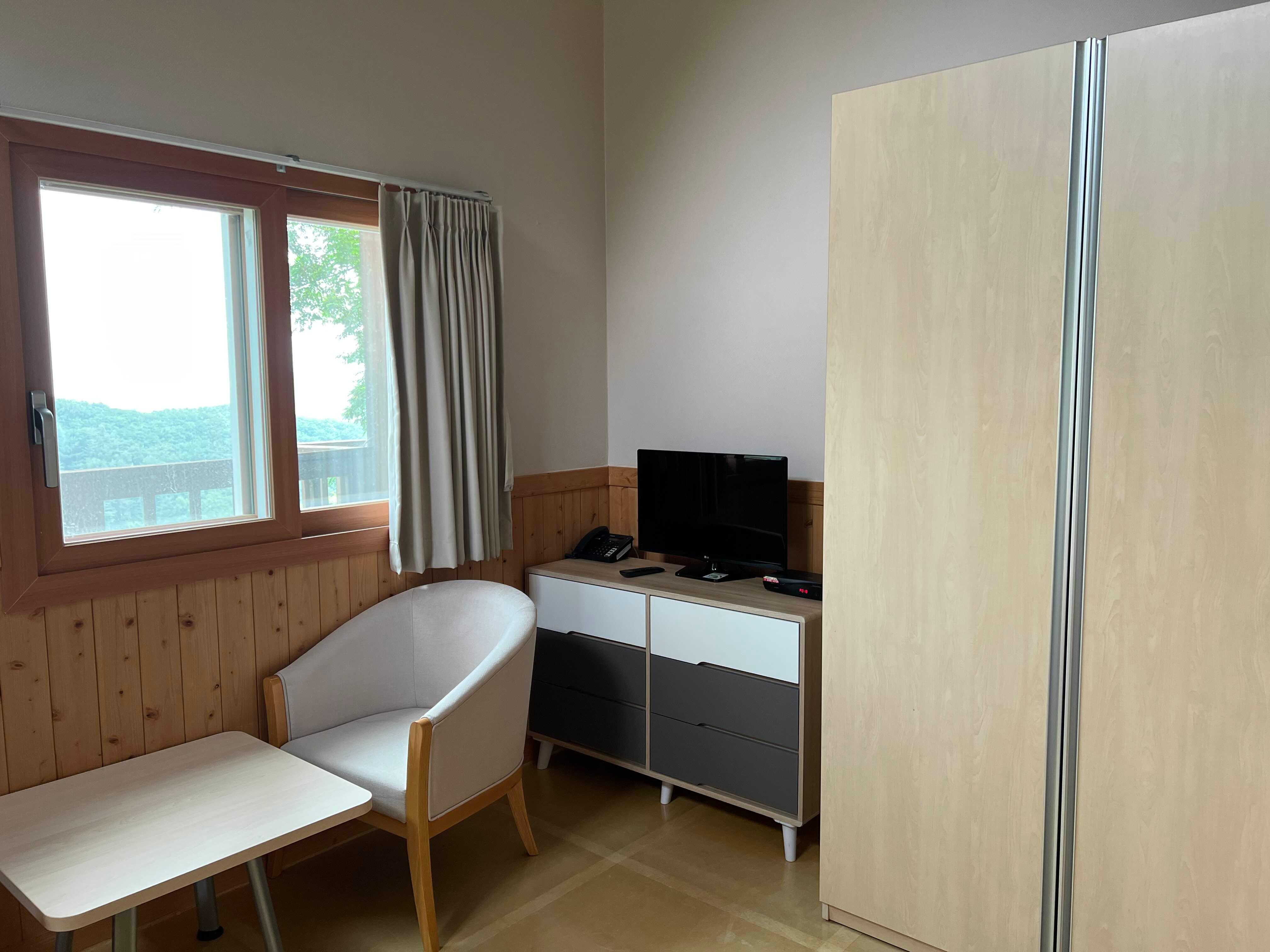 테이블에 소파도 있고, 작은 티비에 옷장도 넉넉