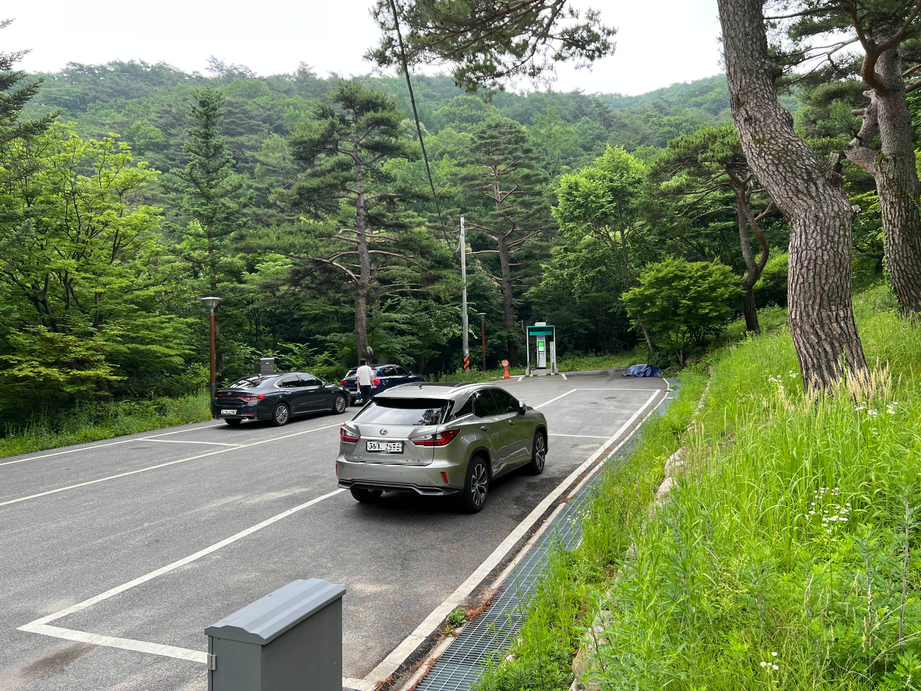 주차장에 갔더니 전기차충전기도 있다. 주차장입구 오른쪽 임도를 약 3-4분 오르면 데크로드 입구가 나온다.