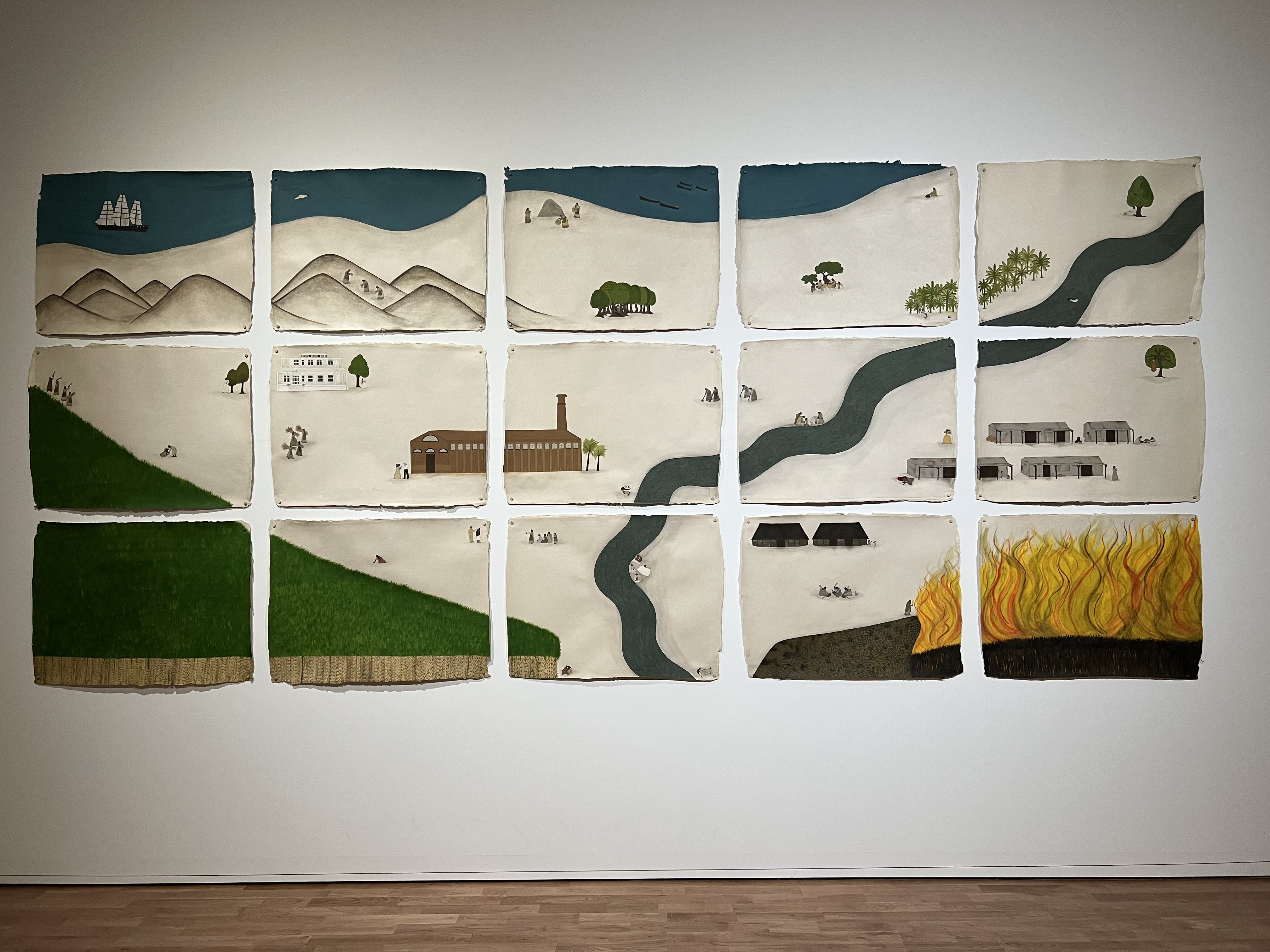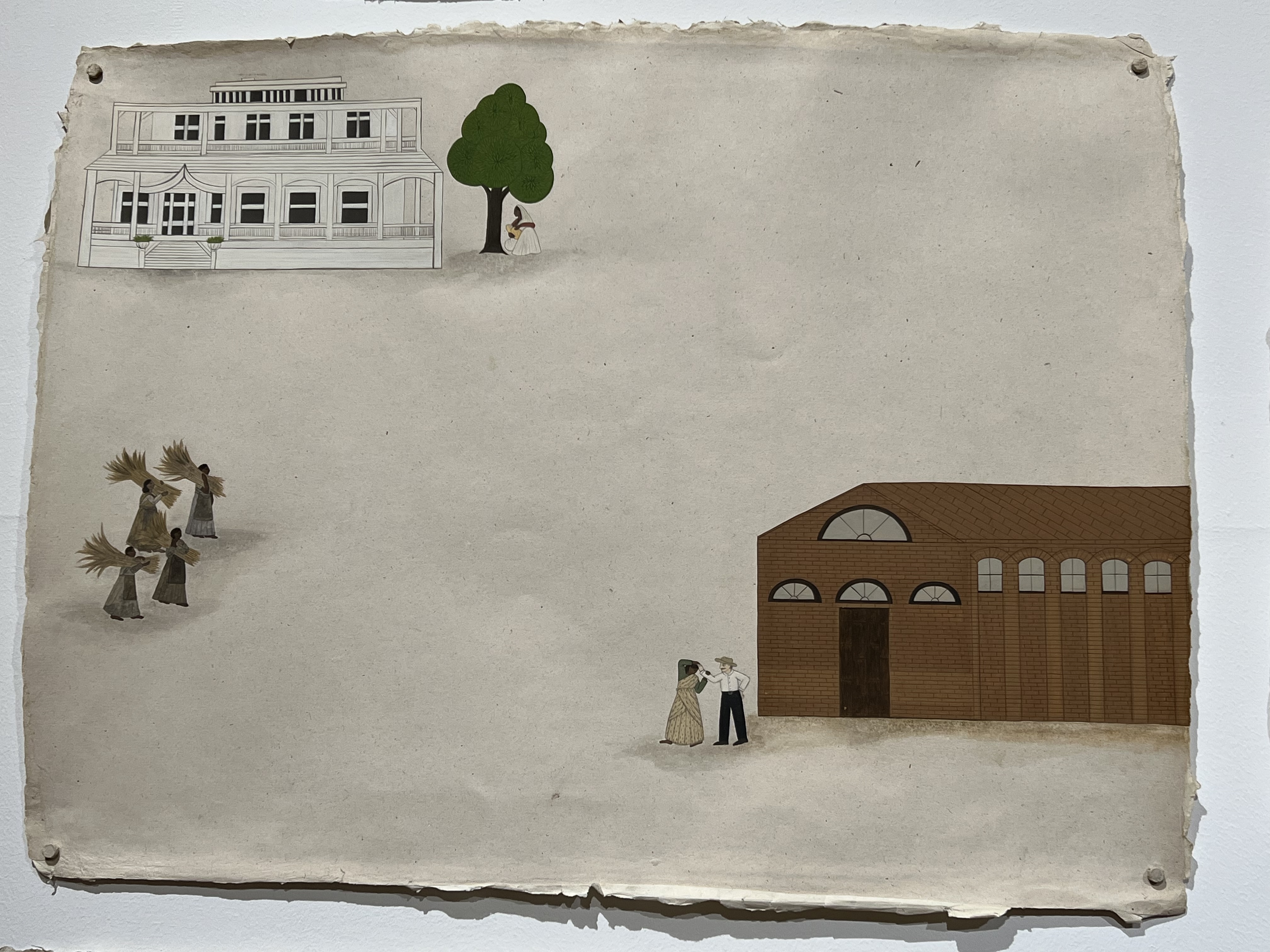"〈쿨리/카람부〉에서 작가는 ‘노동하는 여성’들의 이야기를 기리기 위해 인도의 세밀화 형태를 차용한다. 15점의 그림이 격자 구조로 나뉘어 배치되는 이 작업은 강과 산, 바다 같은 자연 풍경과 함께, 노동자들을 실어 나르던 배, 플랜테이션과 노동자들이 거주하던 시설과 공장 등 식민지 시대의 피폐한 장면들을 엮어 낸다. 타밀어로 ‘쿨리’는 하층 카스트 제도의 운송꾼을 의미하고, ‘카람부’는 사탕수수를 의미한다."