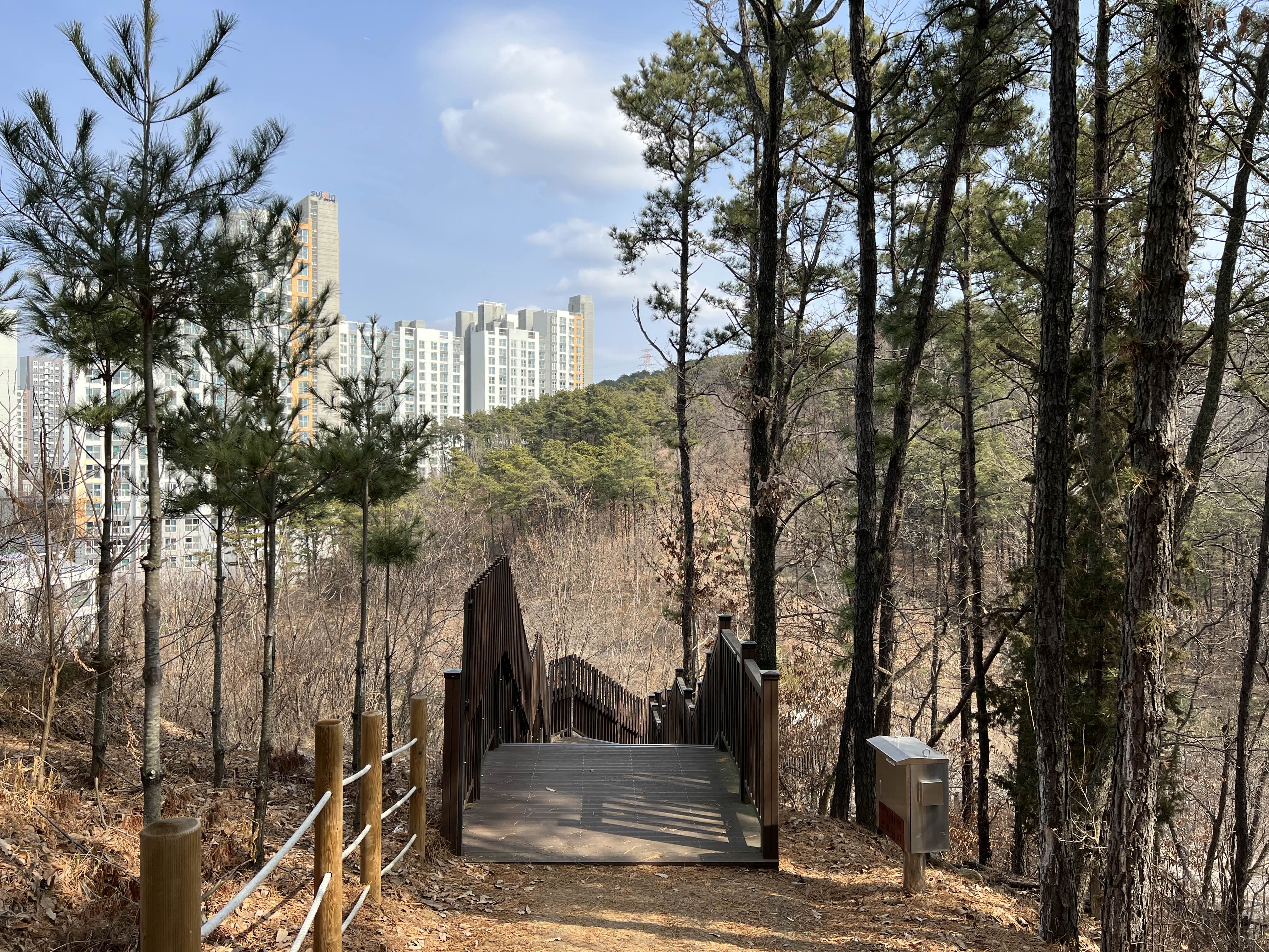 나는 처음에 계단을 내려와가지고 길 따라 걷다가 뒤를 돌아 보니 이렇게 생태 통로가 있는 거다.