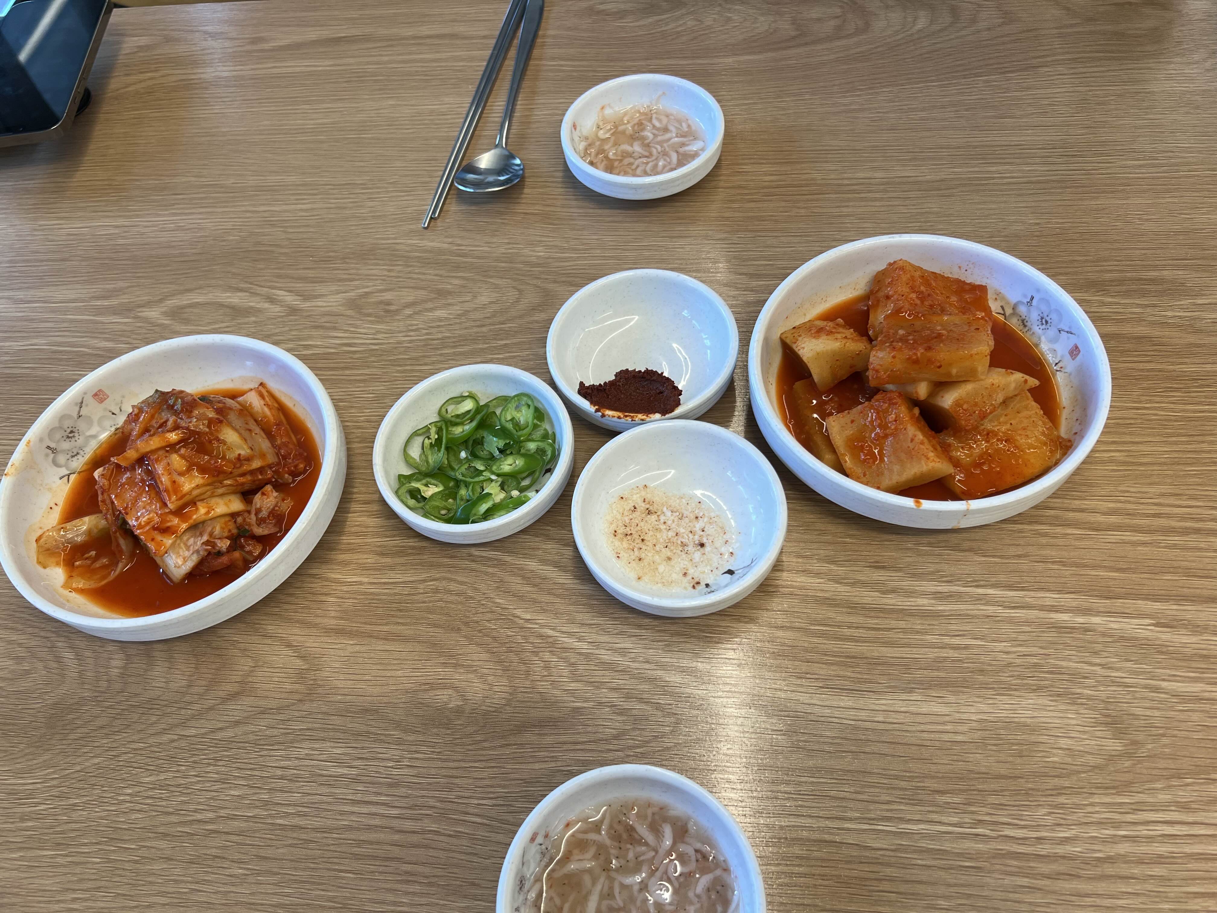 깍두기 김치 등 반찬과 곁들일 소금, 양념장 등이 나온다.