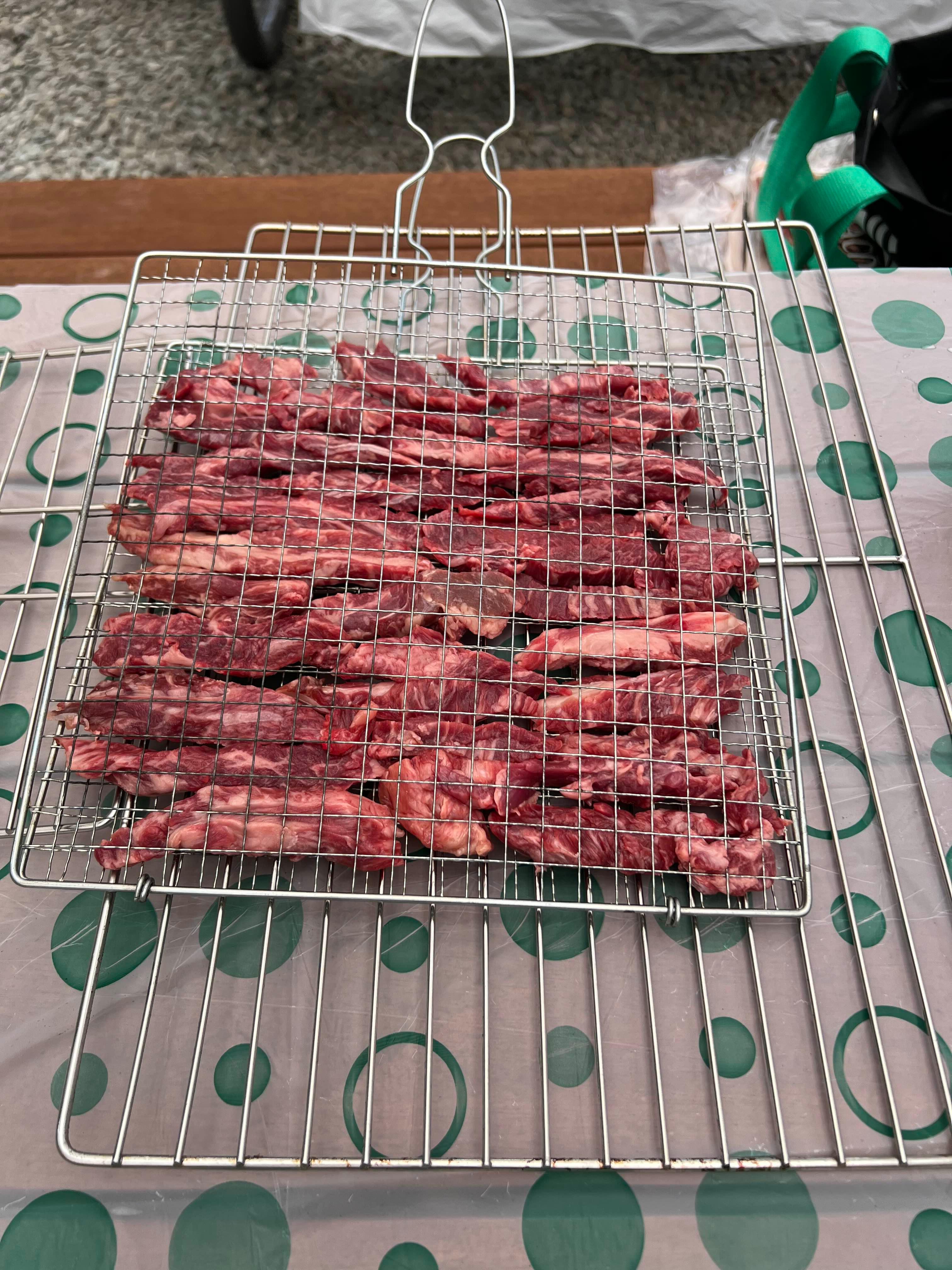 불판 두 개 잇고, 그 위에 꽃갈비살을 얹었다.