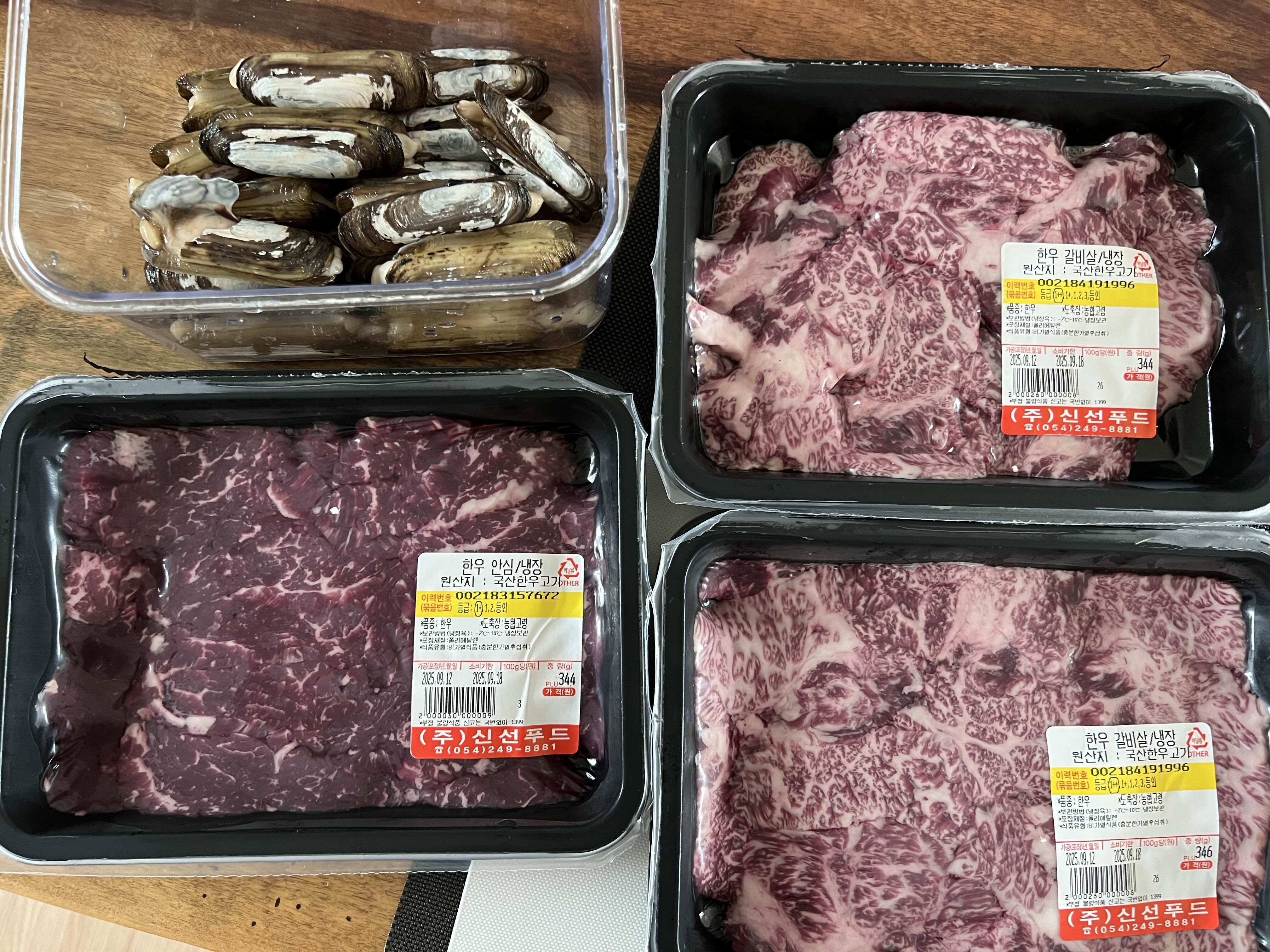 이번엔 맛조개도 가지고 갔다. 지난 번에 1+한우 꽃갈비살이 너무 맛있어서 다시 사려고 했는데 세일 기간이 아니어서