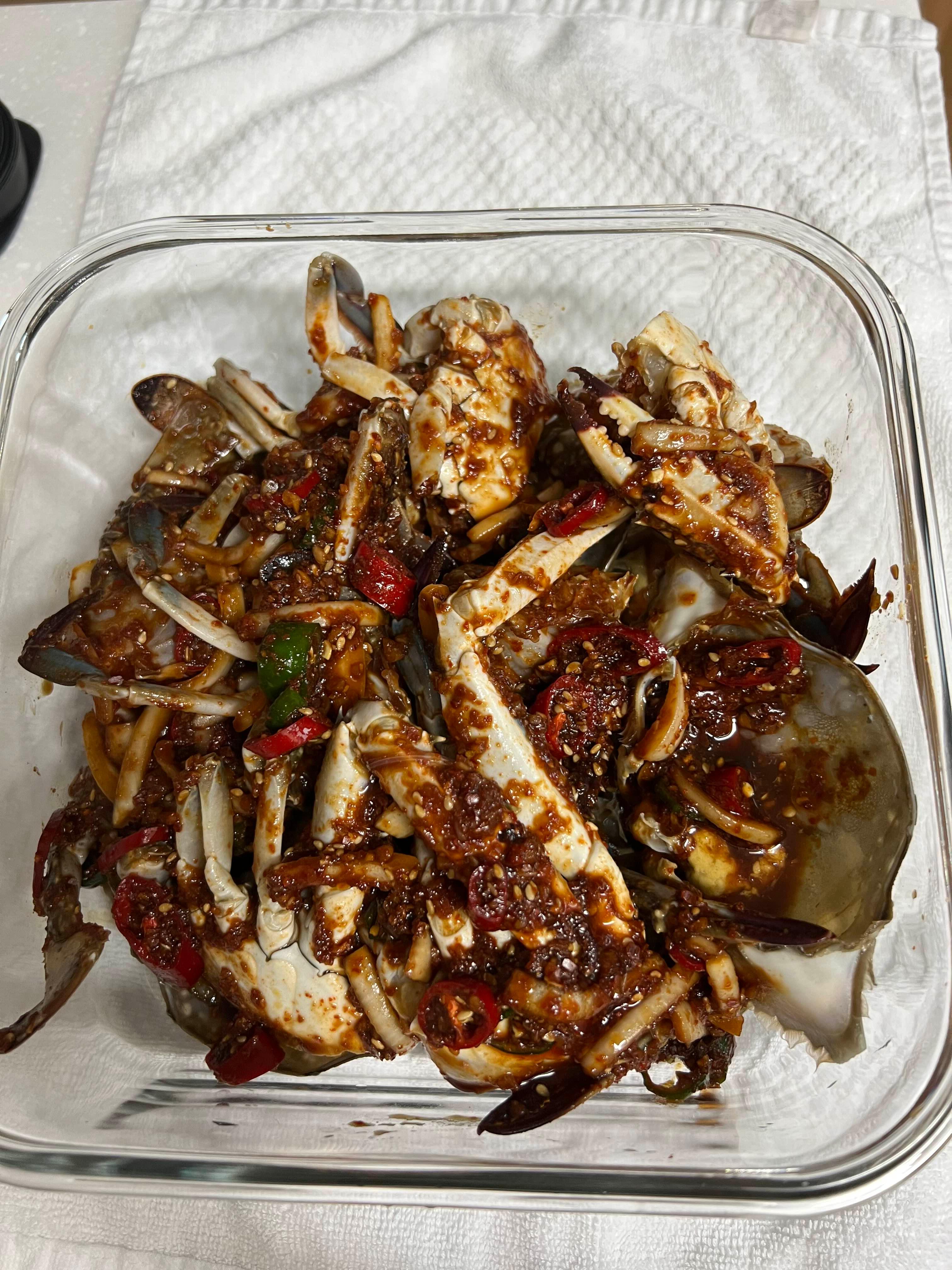 그래서 용기에 게살과 양념장 섞어 2일 더 숙성했더니 좋다. 김냉에서 1주일 정도 넘게 간다. 김냉 '강' 모드였다.