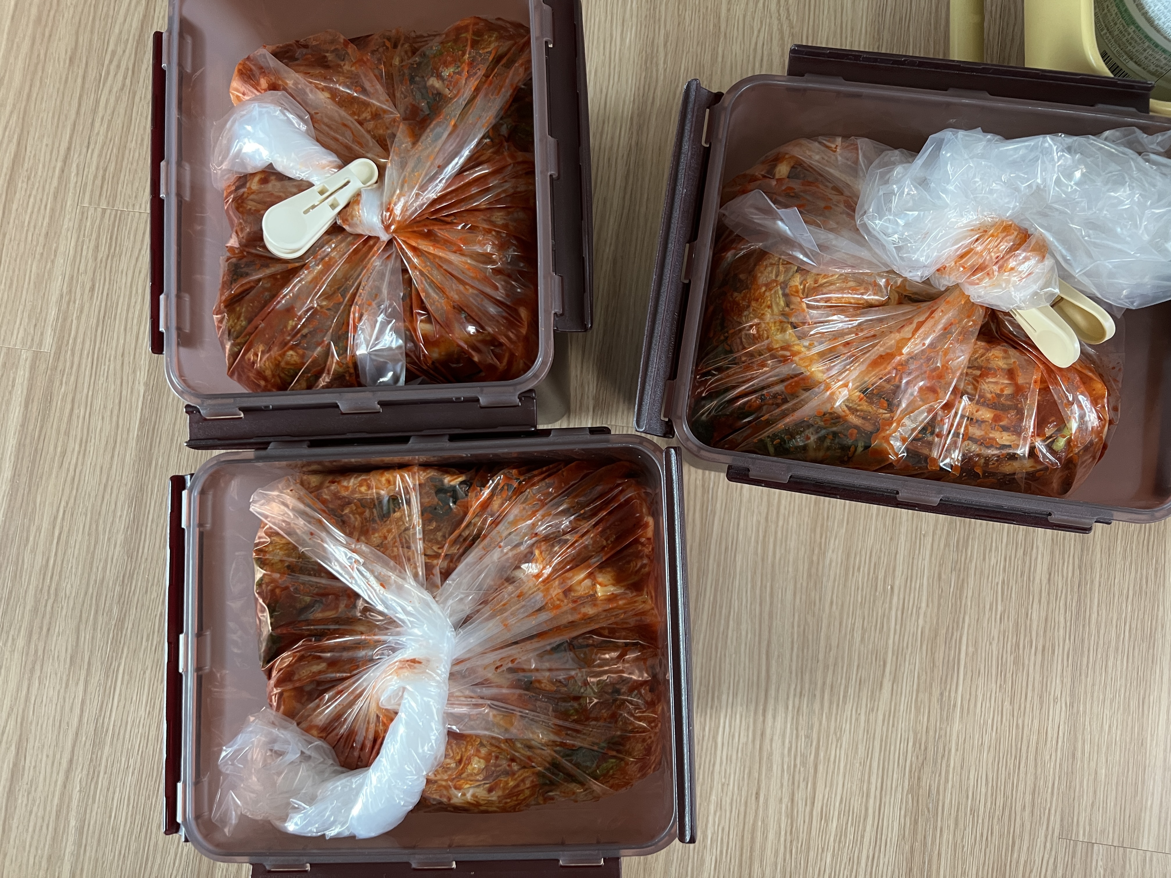 절임배추 20kg이면 디오스 김냉 큰 통으로 3개, 그리고 바로 먹을 김치용(일반 냉장실 보관) 따로 덜어 두면 맞더라.