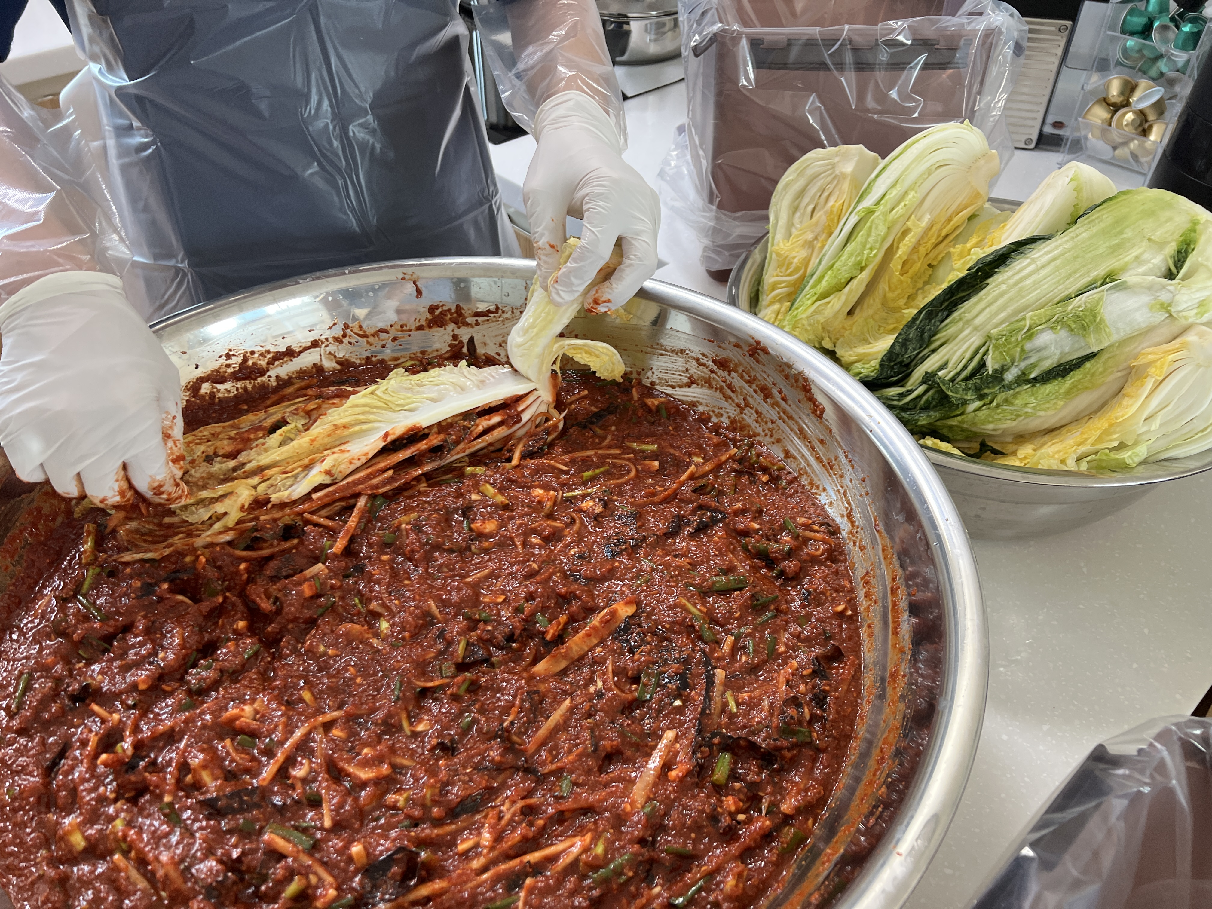 1차로 주방 정리를 한 번 한다. 싹 정리하고, 배추--양념--김치통 이런 동선만 남겨 둔다.