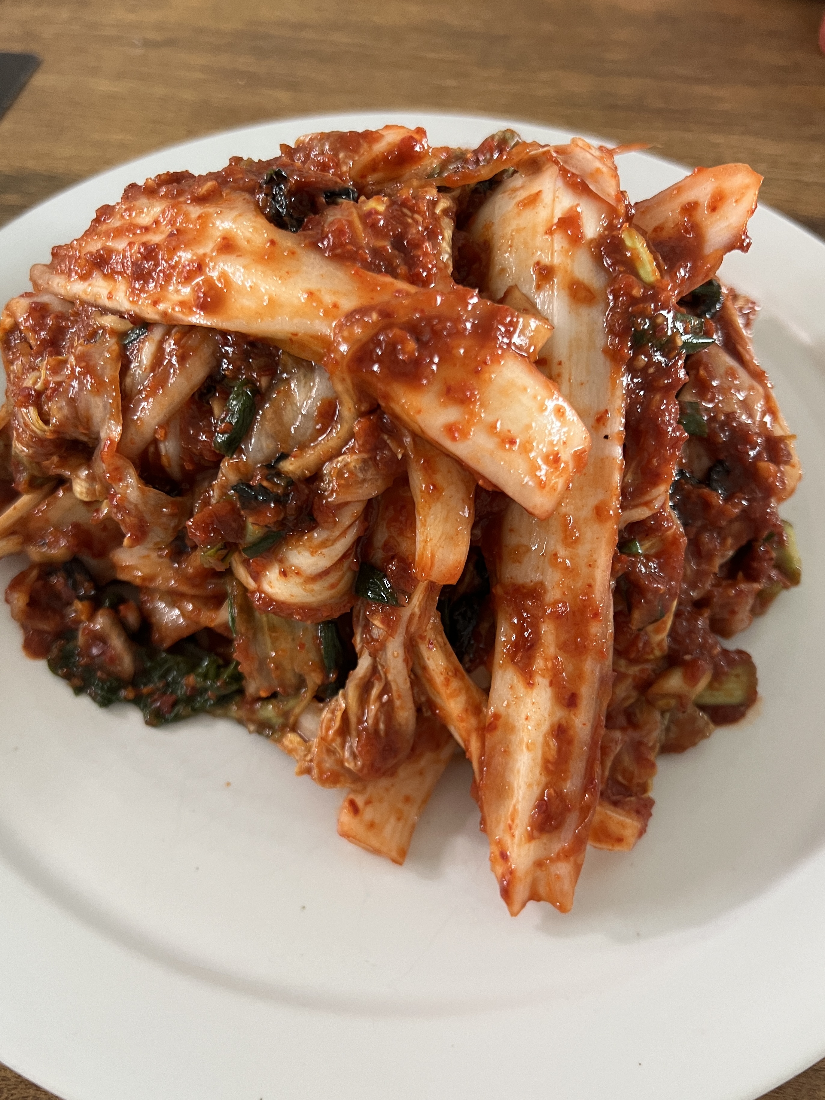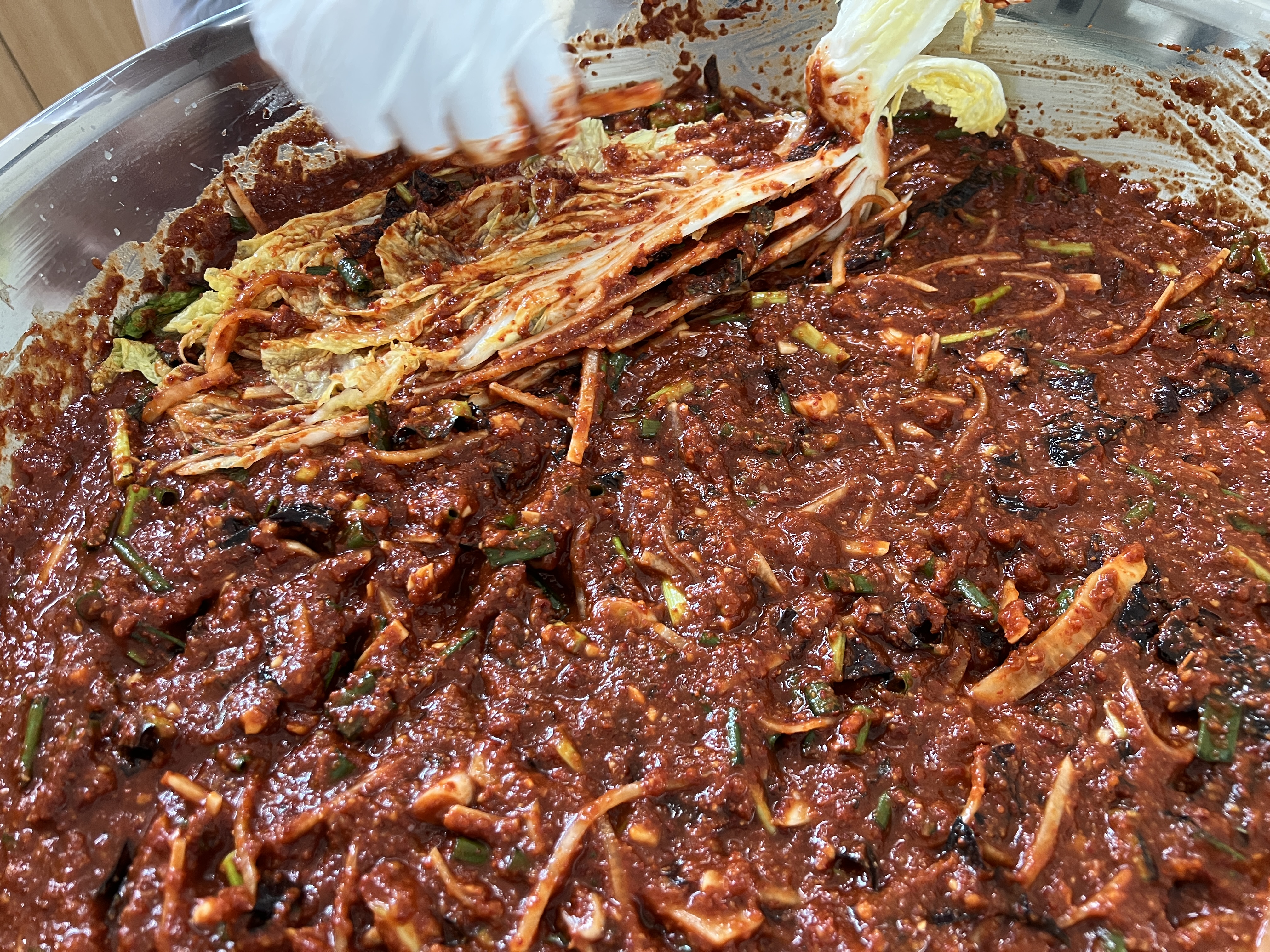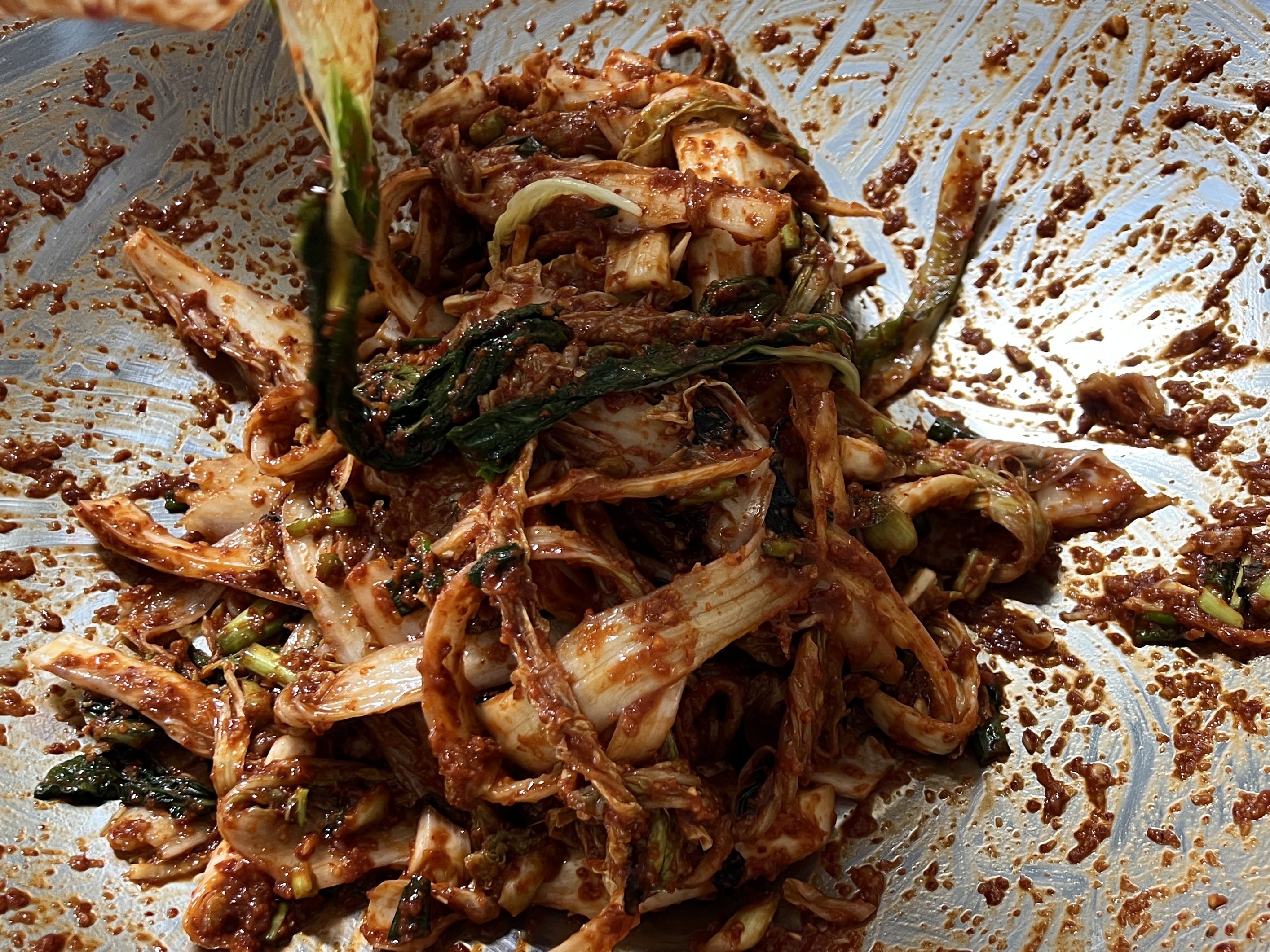 절임배추 한 쪽 떼서 양념에 묻힌 후 간 보는데, 살짝 간간해야 나중에 배추에서 물이 나와서 간이 약해진다. 배추가 절여진 거라 첫 입에 짤 수 있지만 끝까지 다 씹어 본 후 판단하기. 나중에는 배추 내에서 물 나오고 염도 평균이 다 고루 맞춰지기 때문에. 좀 싱거우면 액젓 1c 더 넣고, 그래도 싱거우면 천일염으로 2T 더 넣기.