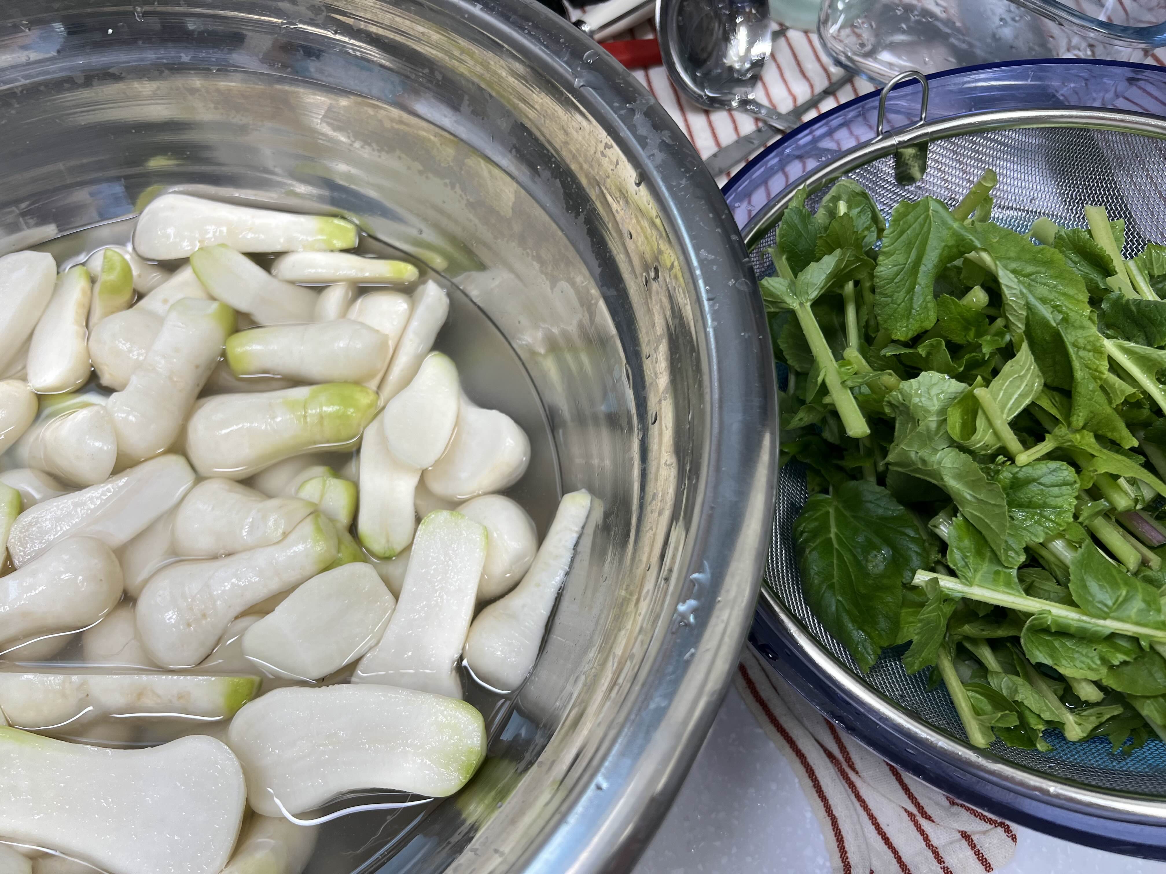 그리고 동치미 담글 천수무도 뒹굴 뒹굴 소금에 절이고 있다. 최소 24시간은 절여야 해서.