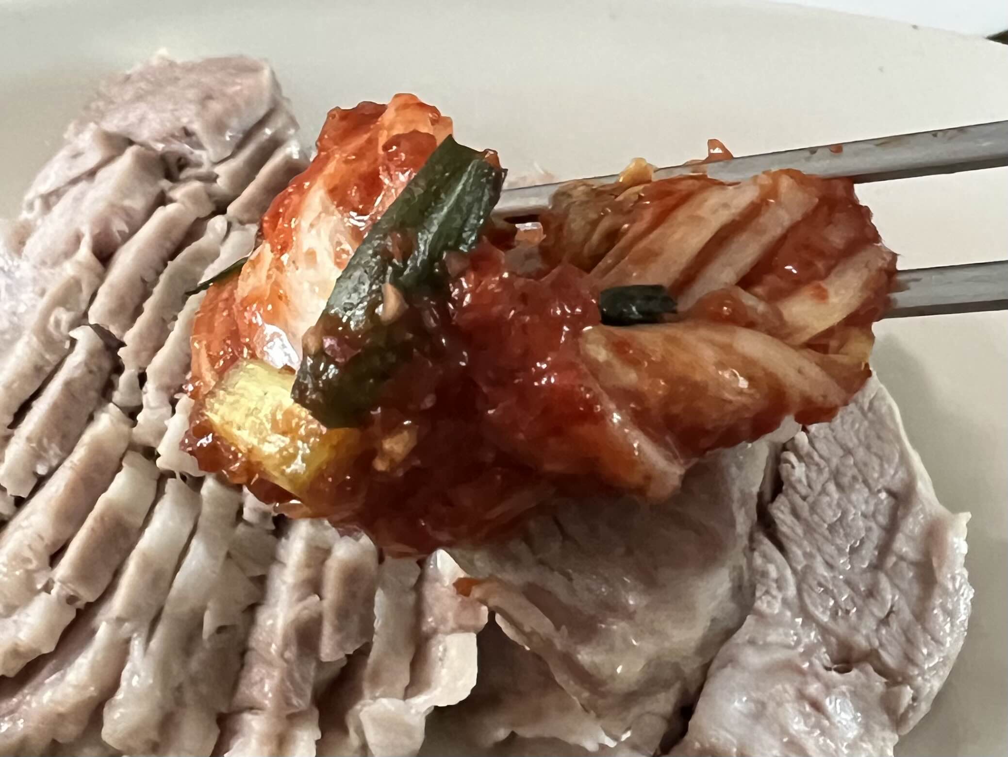 7. 이제 최종 간 보기. 아까처럼 절임배추 한 잎 떼서 양념과 함께 먹어 보기. 내 입맛보다 10% 살짝 더 짜도 괜찮다.