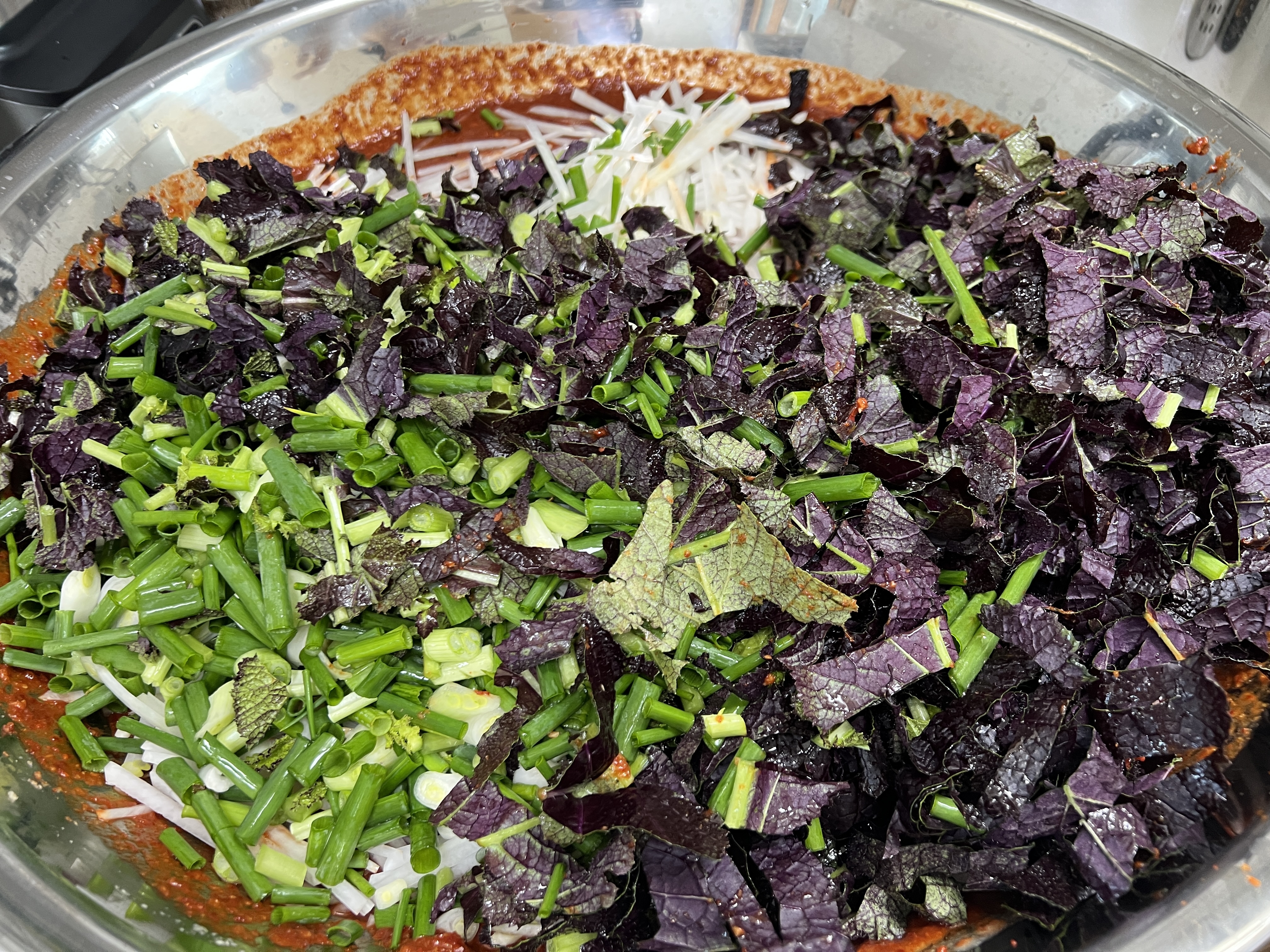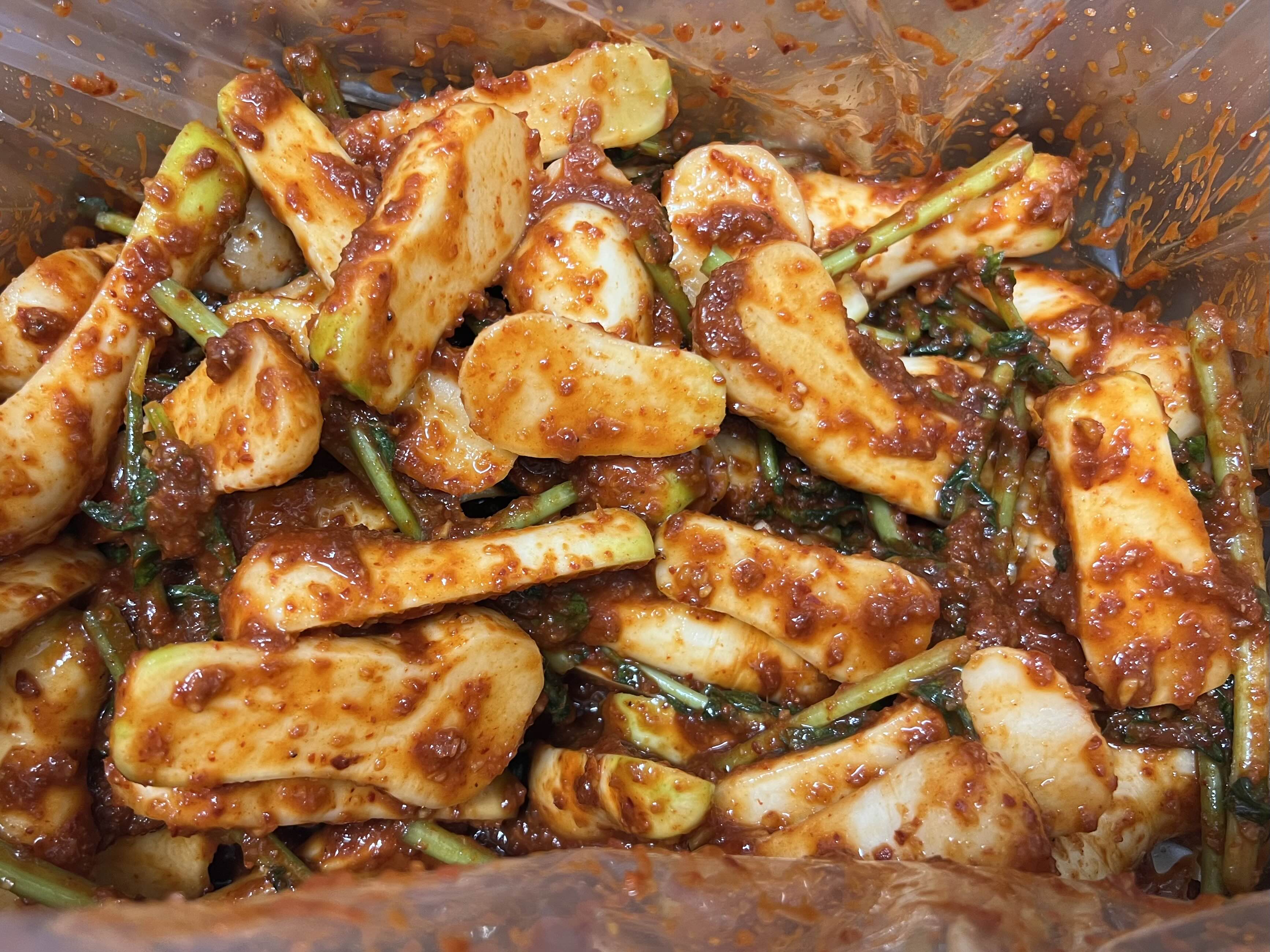 쪽파 손질 다 한 것 450g 손가락 길이로 썰기, 홍갓 300g 손가락 길이로 썰기, 무 1개 채썰기