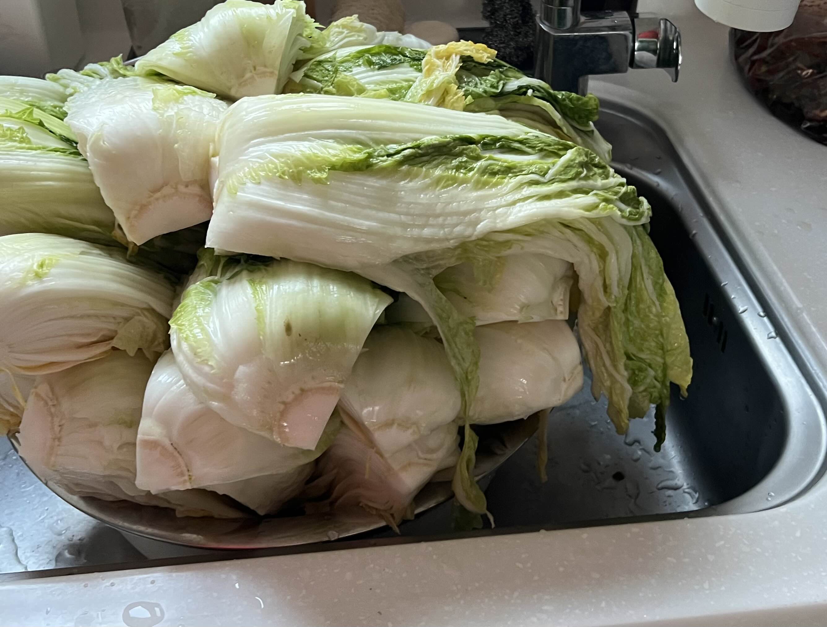 1. 절임배추를 채반에 올려 물기를 뺀다. (2시간 정도가 적당. 더 지나면 건조해진다.)