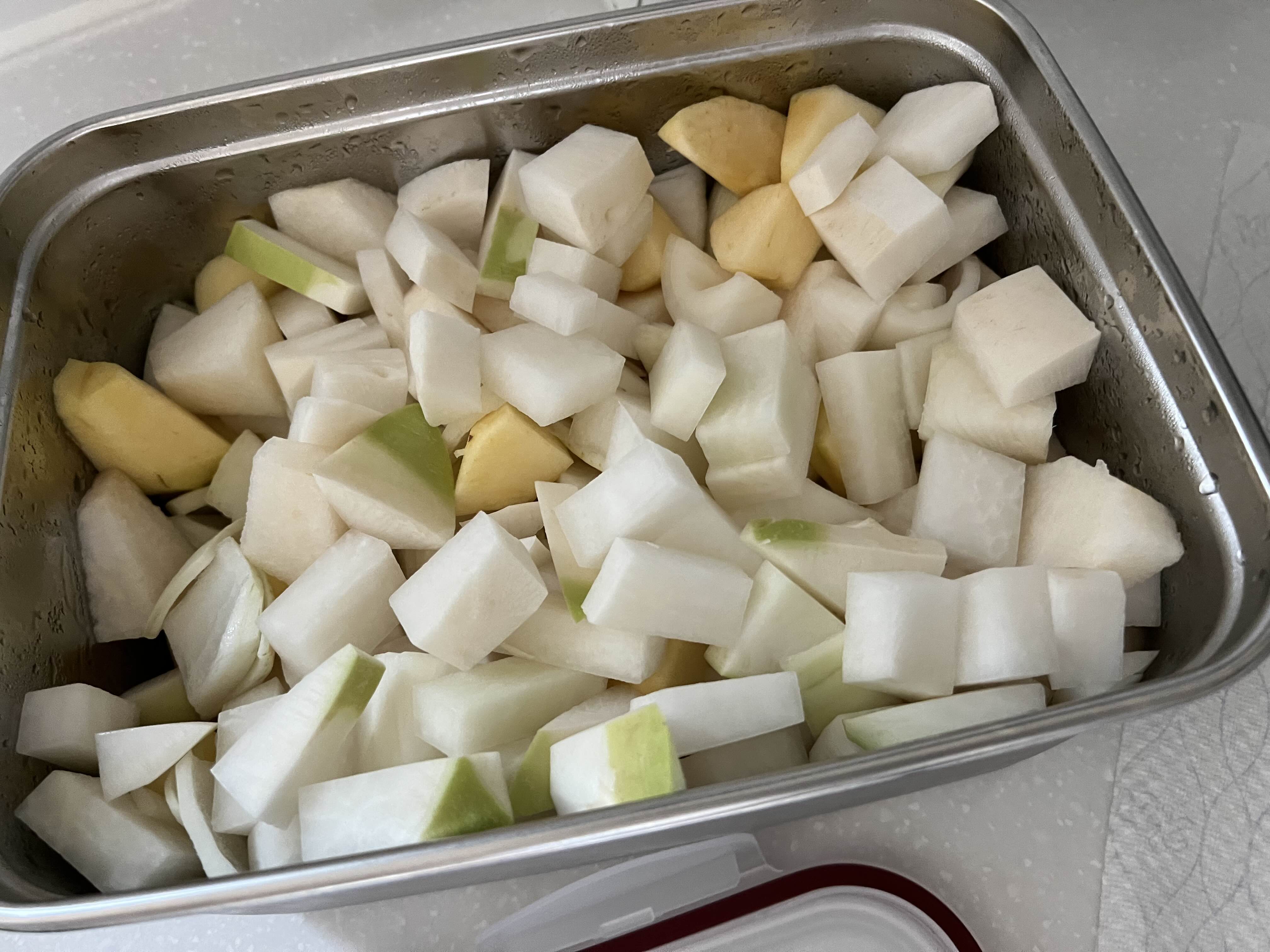 (무 1개, 마늘 세 줌, 생강 두 쪽, 배 1개, 사과 3개, 양파 2개)