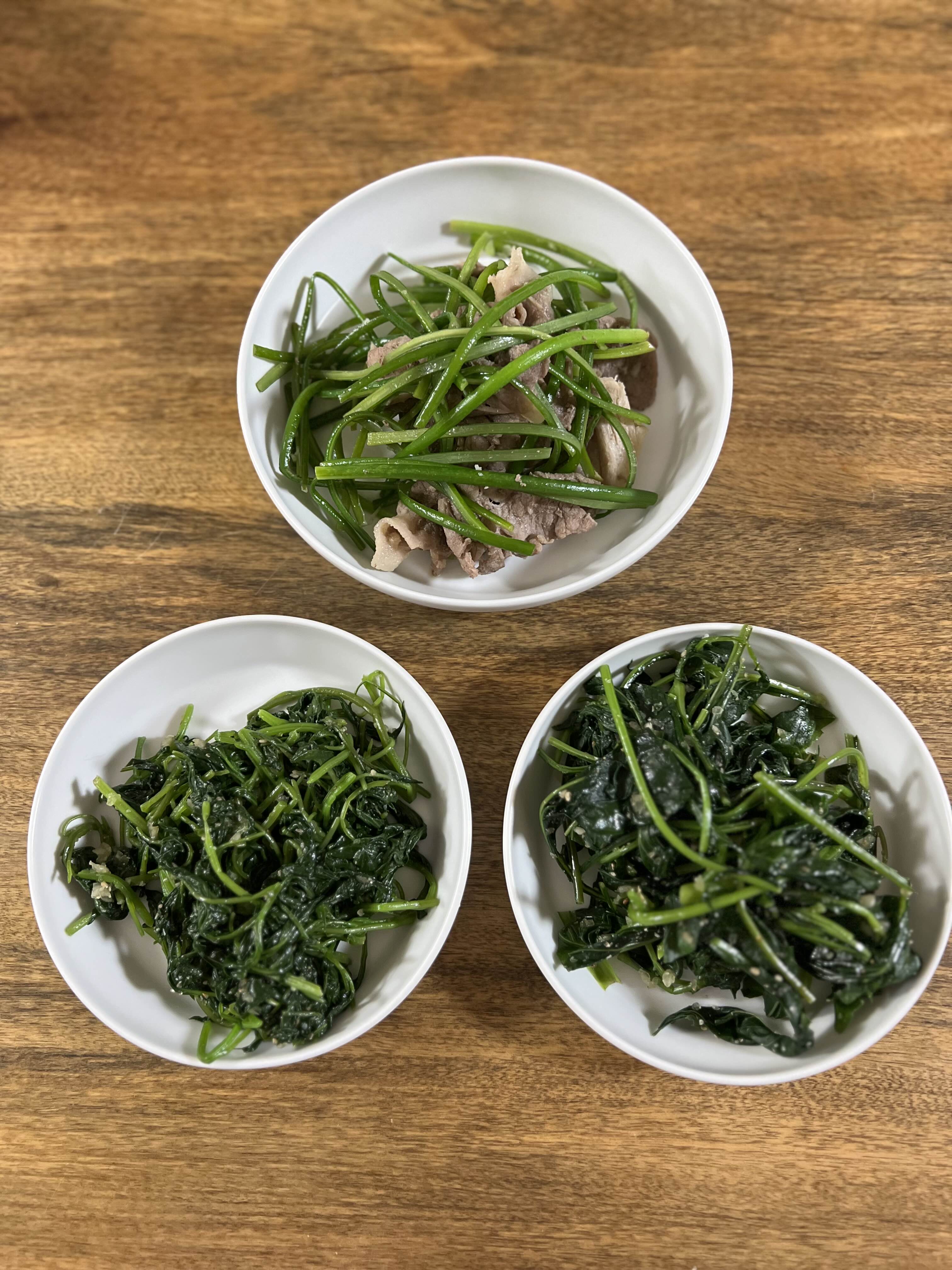 마늘쫑 네 등분해서 대패 삼겹살과 마늘쫑 잡채를 한 것과, 여러 나물들로 한 끼