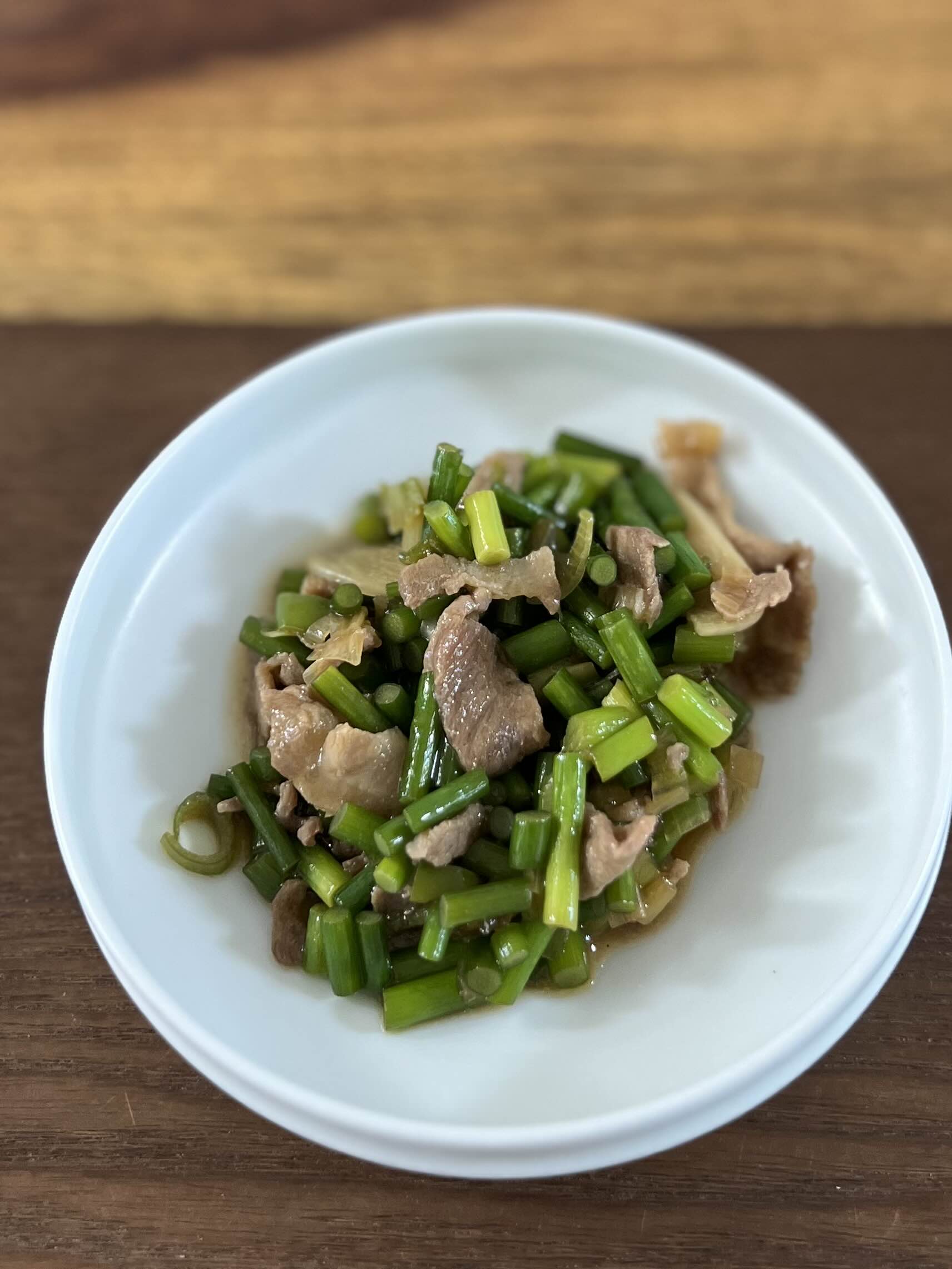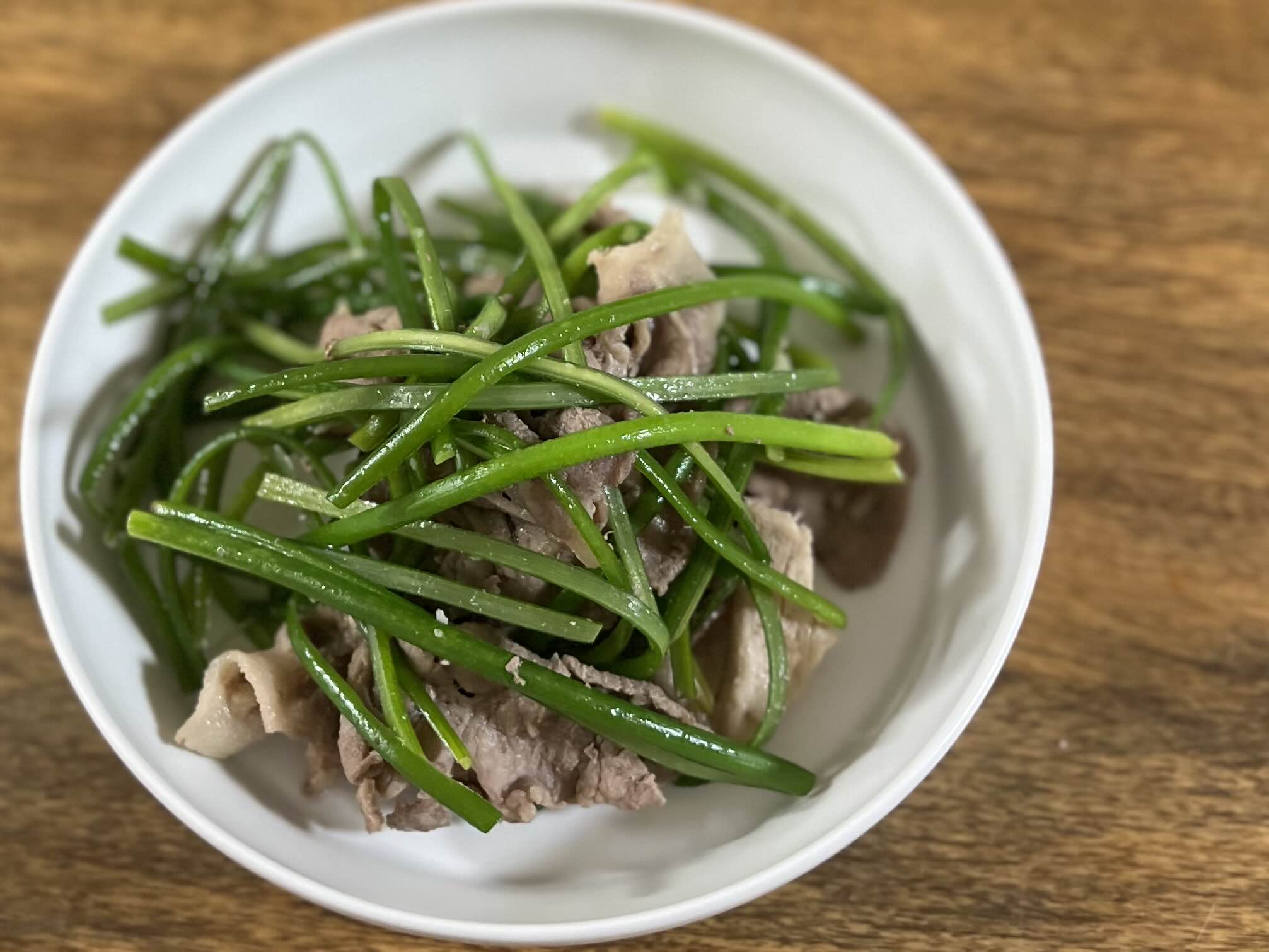 마늘쫑 꼬다리 남은 것으로 쫑쫑 썰어 동남아식 돼지고기 볶음을 했다.