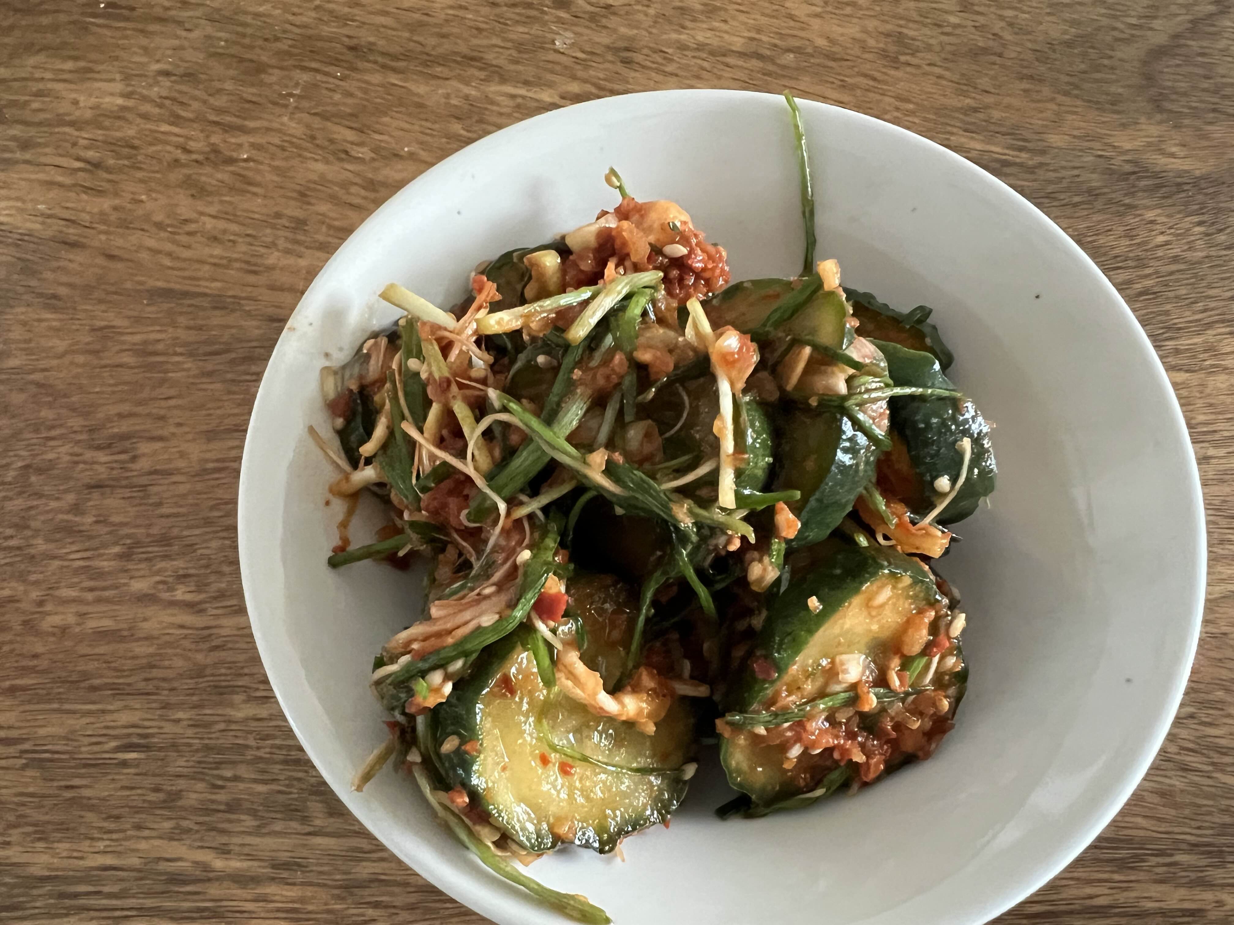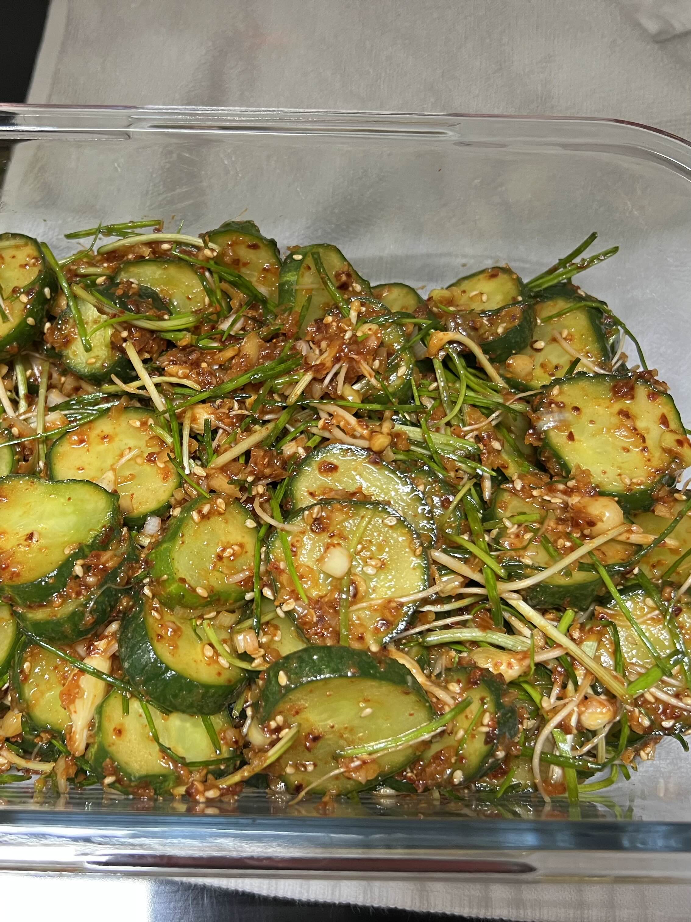 오이가 몇 개 있어서 달래랑 같이 무쳤다.