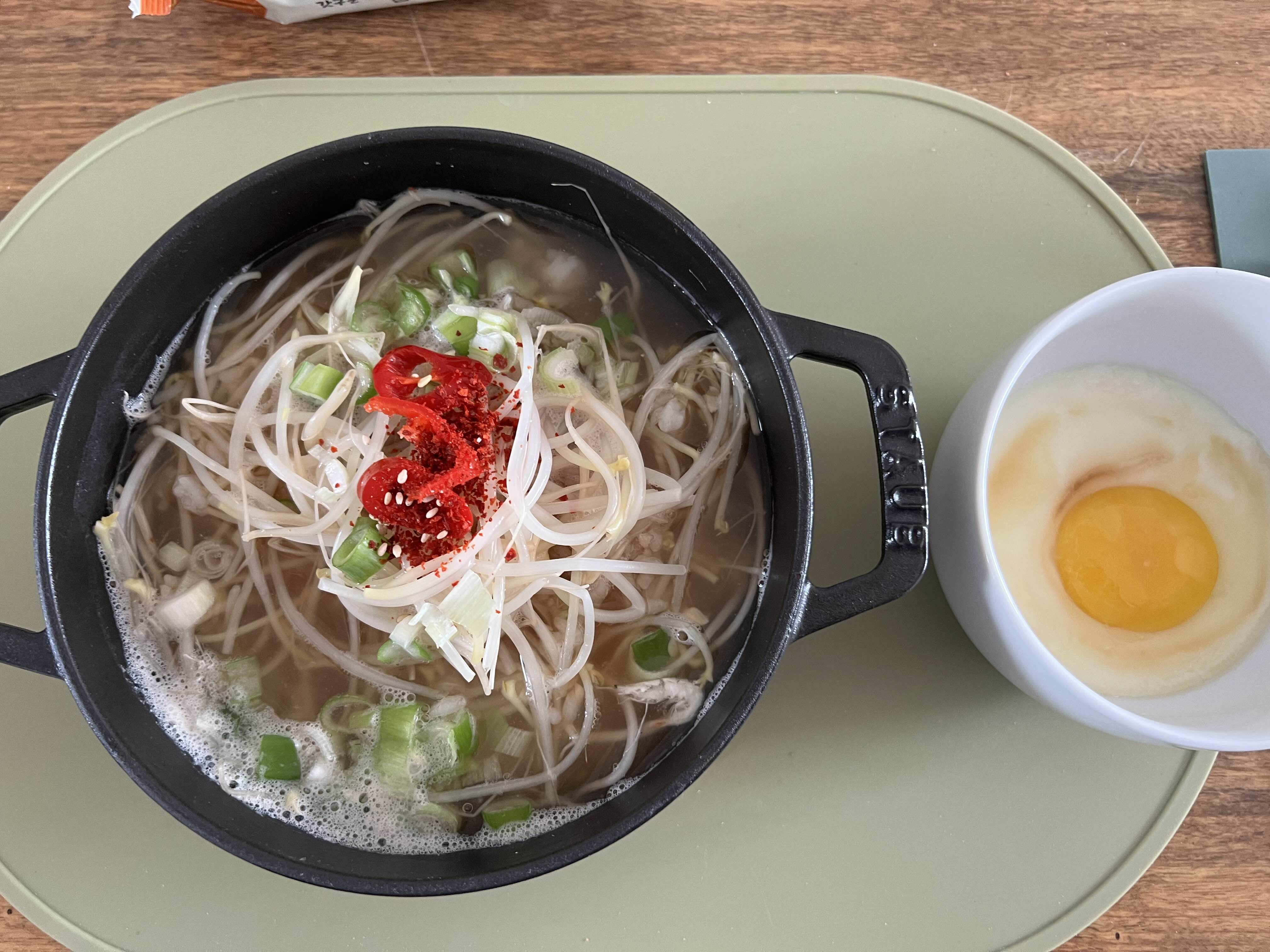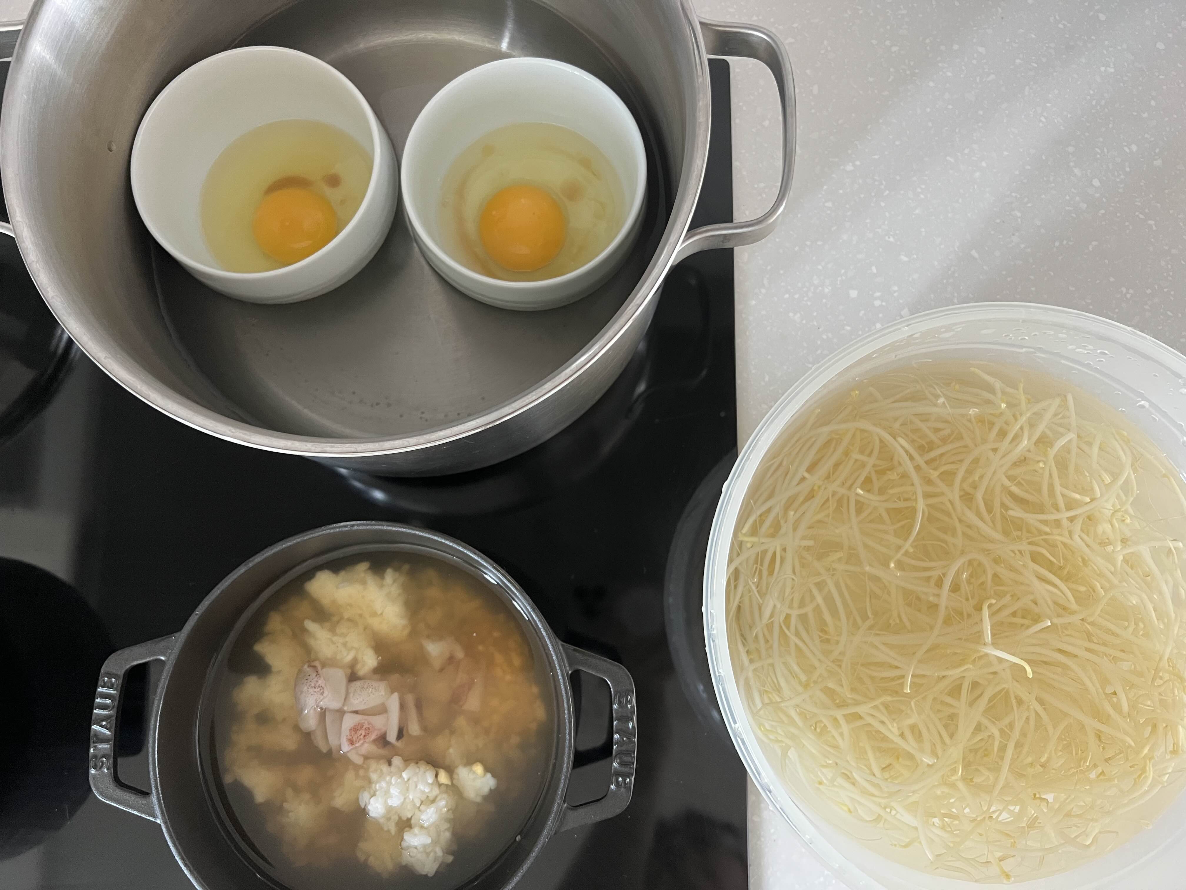찬 밥 한덩이 넣고, 육수 넣고 오징어 반줌 다진마늘 약간 넣고 끓이다가 마지막에 콩나물 한웅큼 올려 바르르 끓으면 상에 낸다.