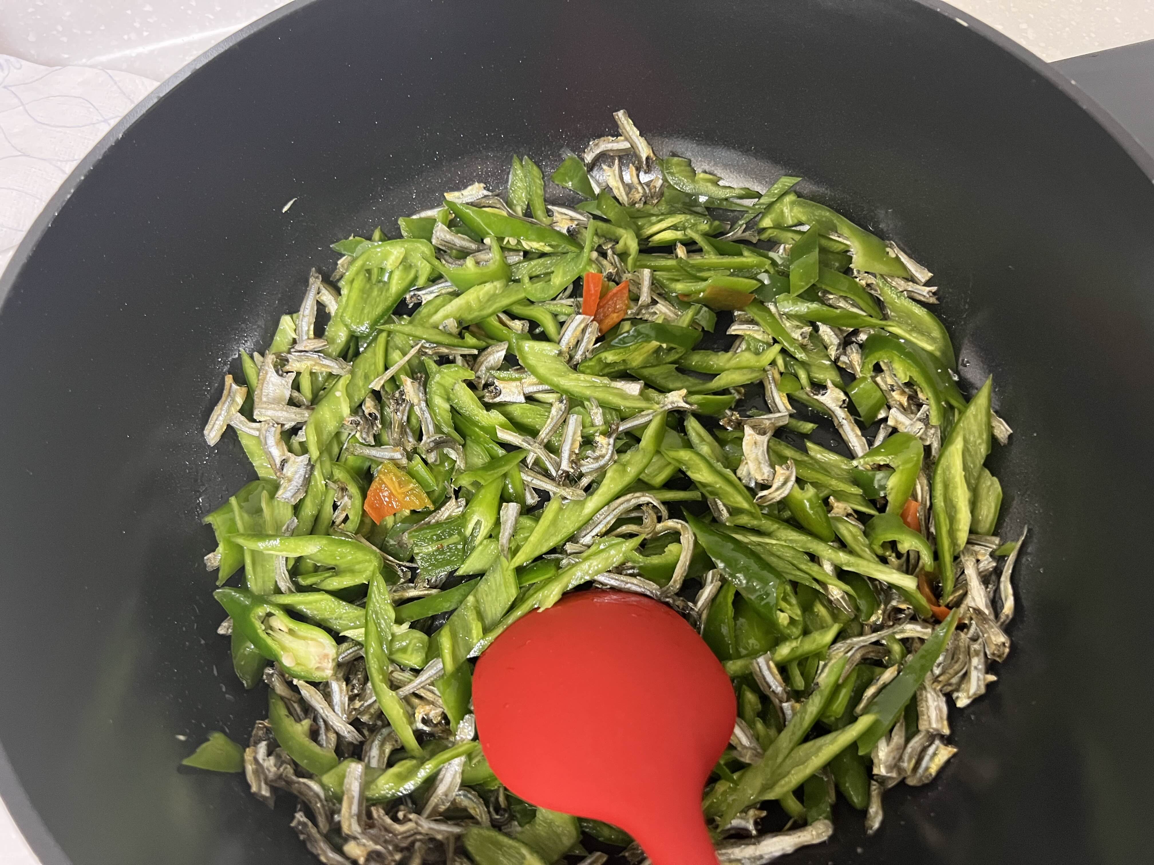 매운 것을 못 먹어서 오이맛고추, 풋고추를 주로 쓰고 10% 정도만 청양고추를 넣는다. 멸치는 국물용 멸치를 대가리와 내장을 뗀 것을 뚝뚝 잘라 써야 하는데, 이번에는 중멸치밖에 없어서 그것으로 했다. 일단 마른 팬에 좀 볶다가.
