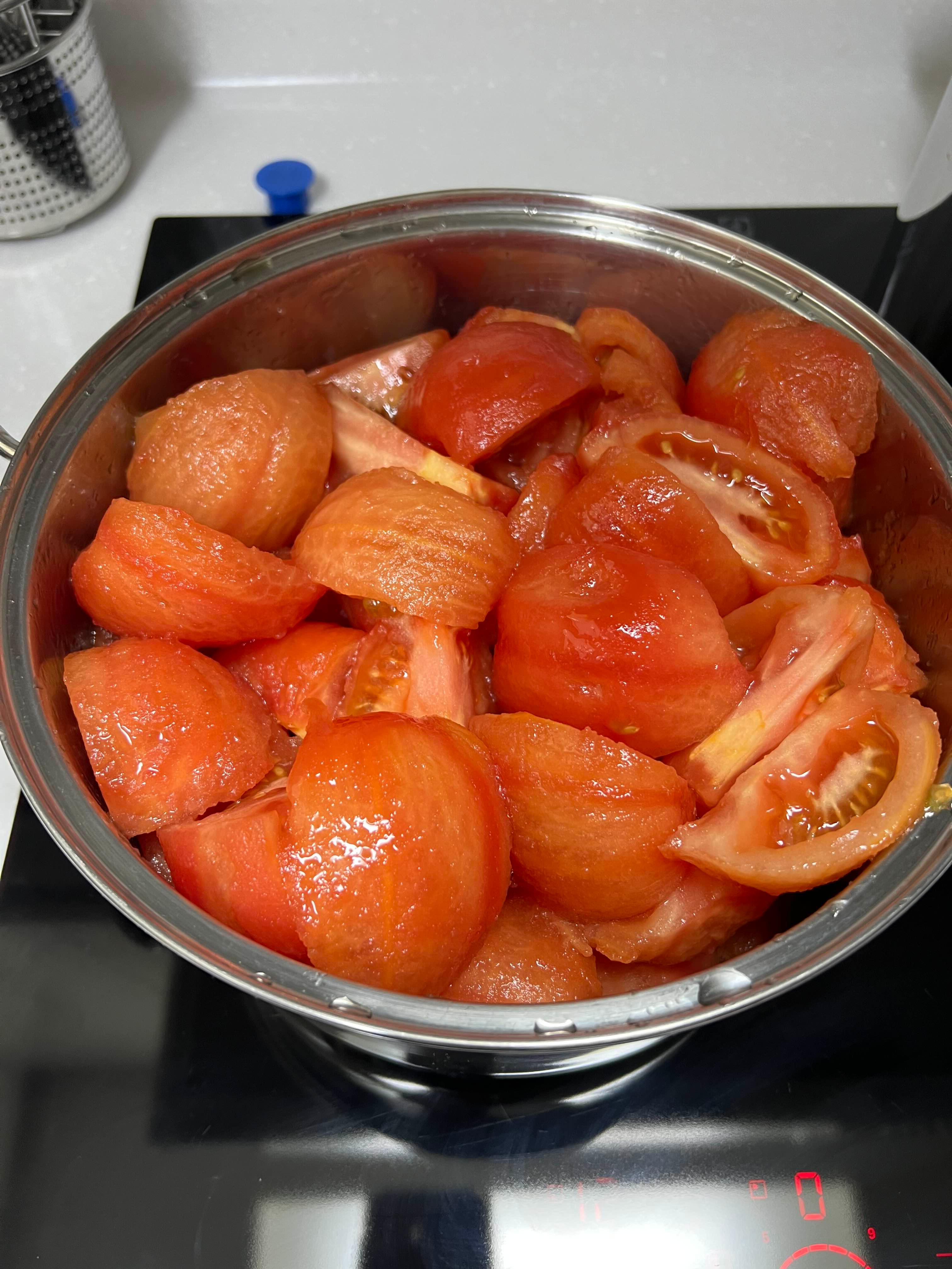 칼집 내서 끓는 물에 토마토 담그면 껍질이 잘 벗겨진다. 귀찮지만 이렇게 껍질을 벗긴 토마토를 익힌다.