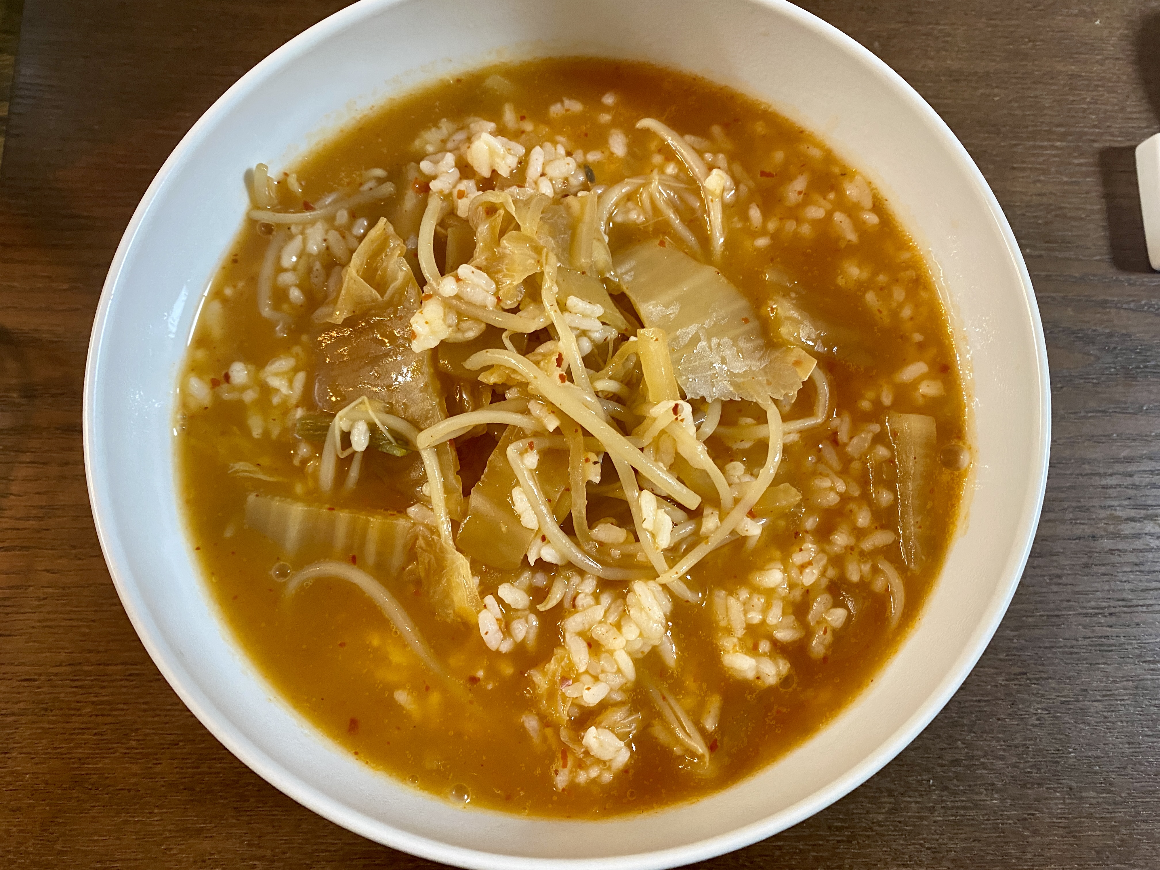 찬 밥이라서 녹말이 다 퍼지기 전이라 국물이 찰랑찰랑 시원하면서도 뜨끈하다. 경북 산골식 콩나물 국밥같은 것